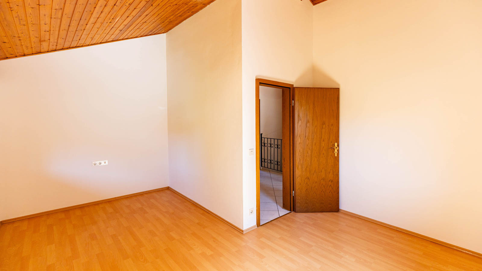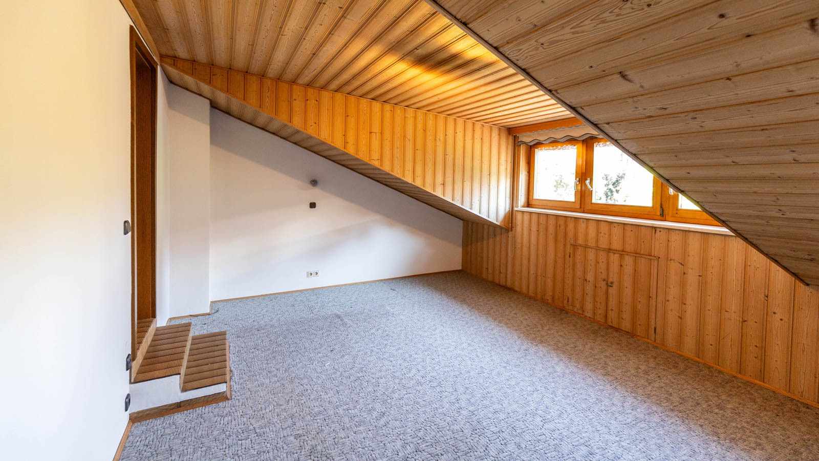 Im Obergeschoss finden sich mehrere individuell nutzbare Räume – ideal als Schlaf-, Kinder- oder Arbeitszimmer. Ein heller Laminatboden und große Fenster unterstreichen das luftige Wohngefühl. Ein Raum ist aktuell mit Teppichboden versehen. Das Tageslichtbad ist mit Badewanne, Dusche, Waschbecken und WC ausgestattet und klassisch gefliest.