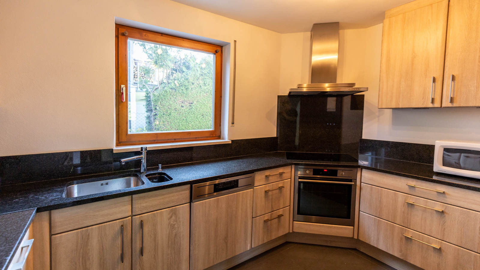 Die separate Küche ist funktional ausgestattet und verfügt über eine gepflegte und voll funktionsfähige Einbauküche mit allen Elektrogeräten, darunter ein Backofen in komfortabler Höhe. Der geflieste Boden und die praktische Raumaufteilung bieten Alltagstauglichkeit und genügend Platz für Kochbegeisterte.