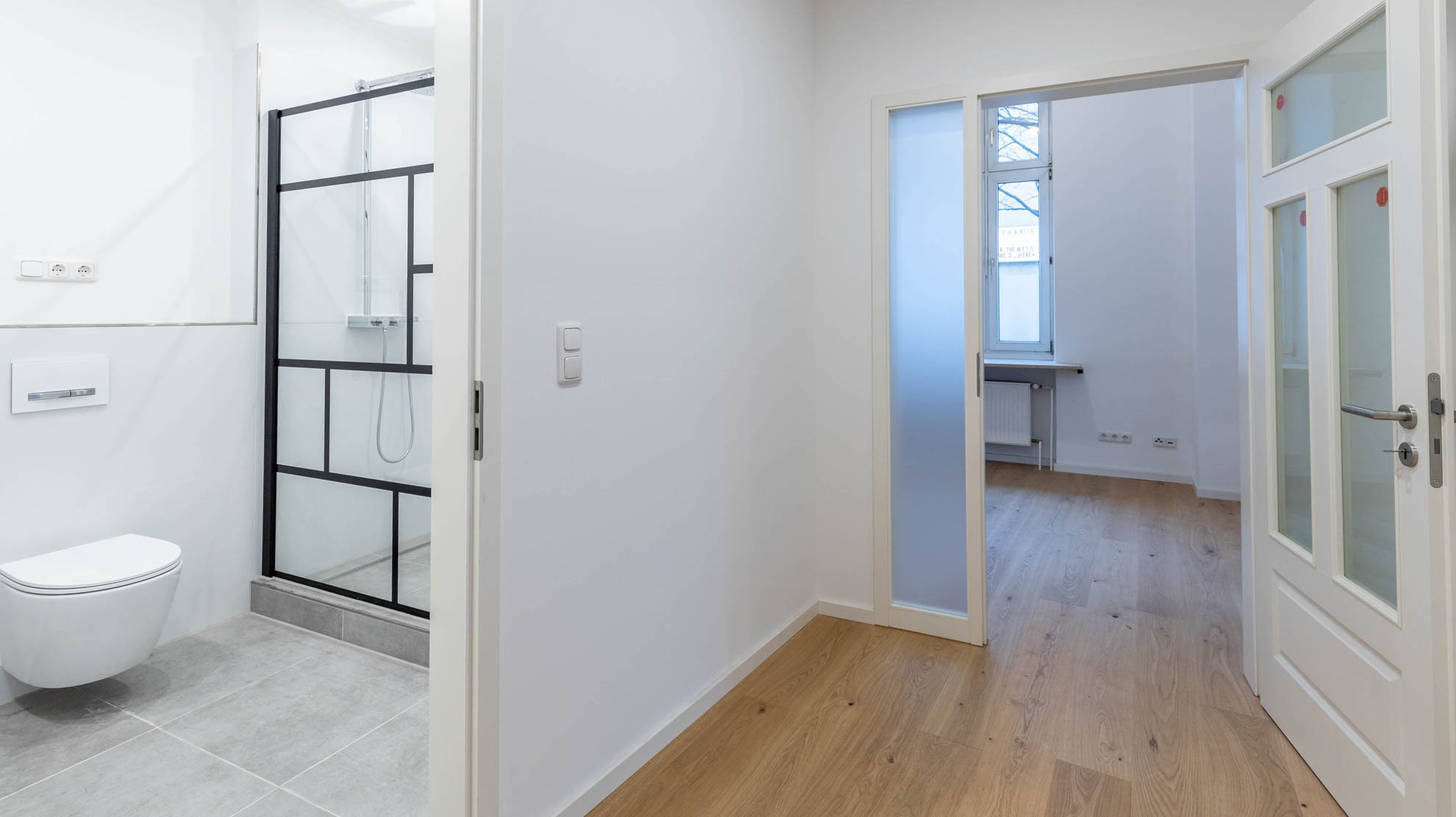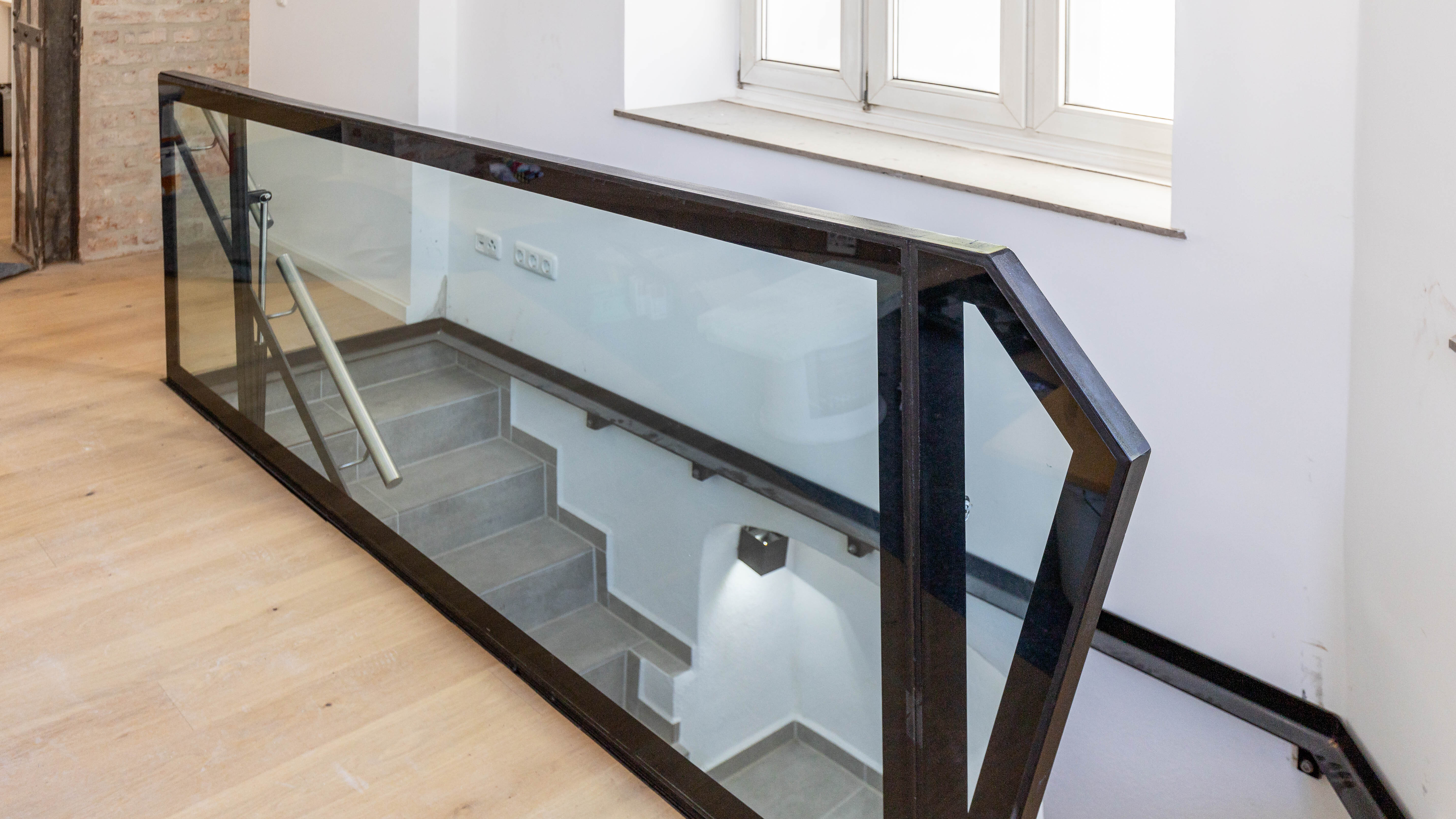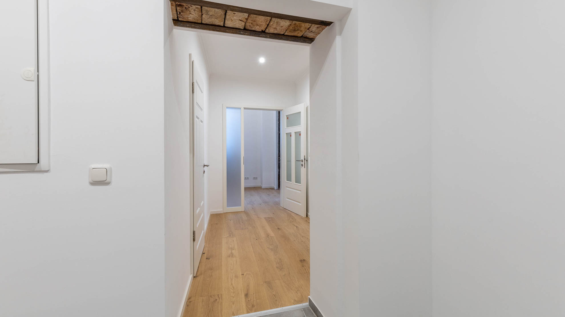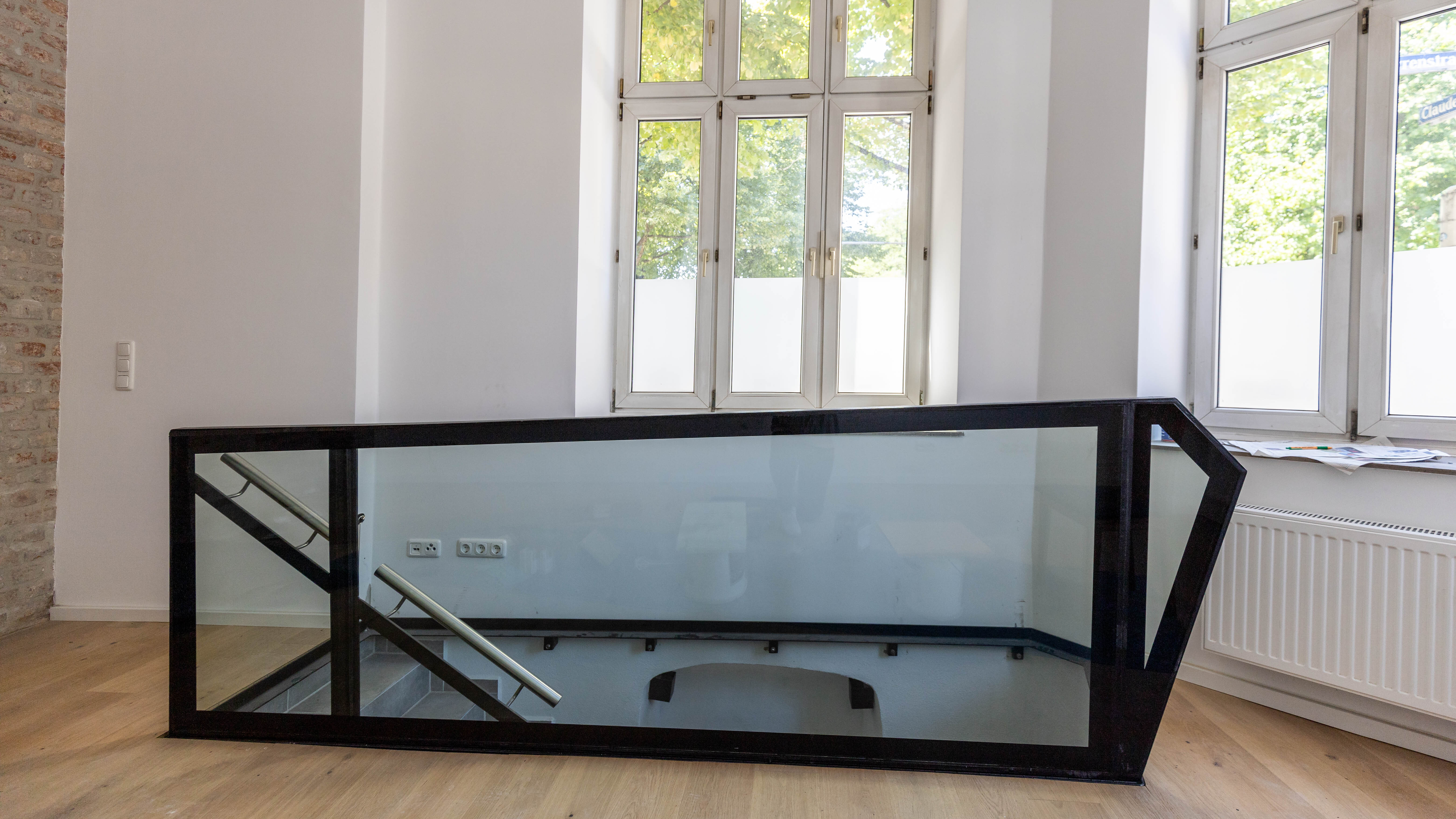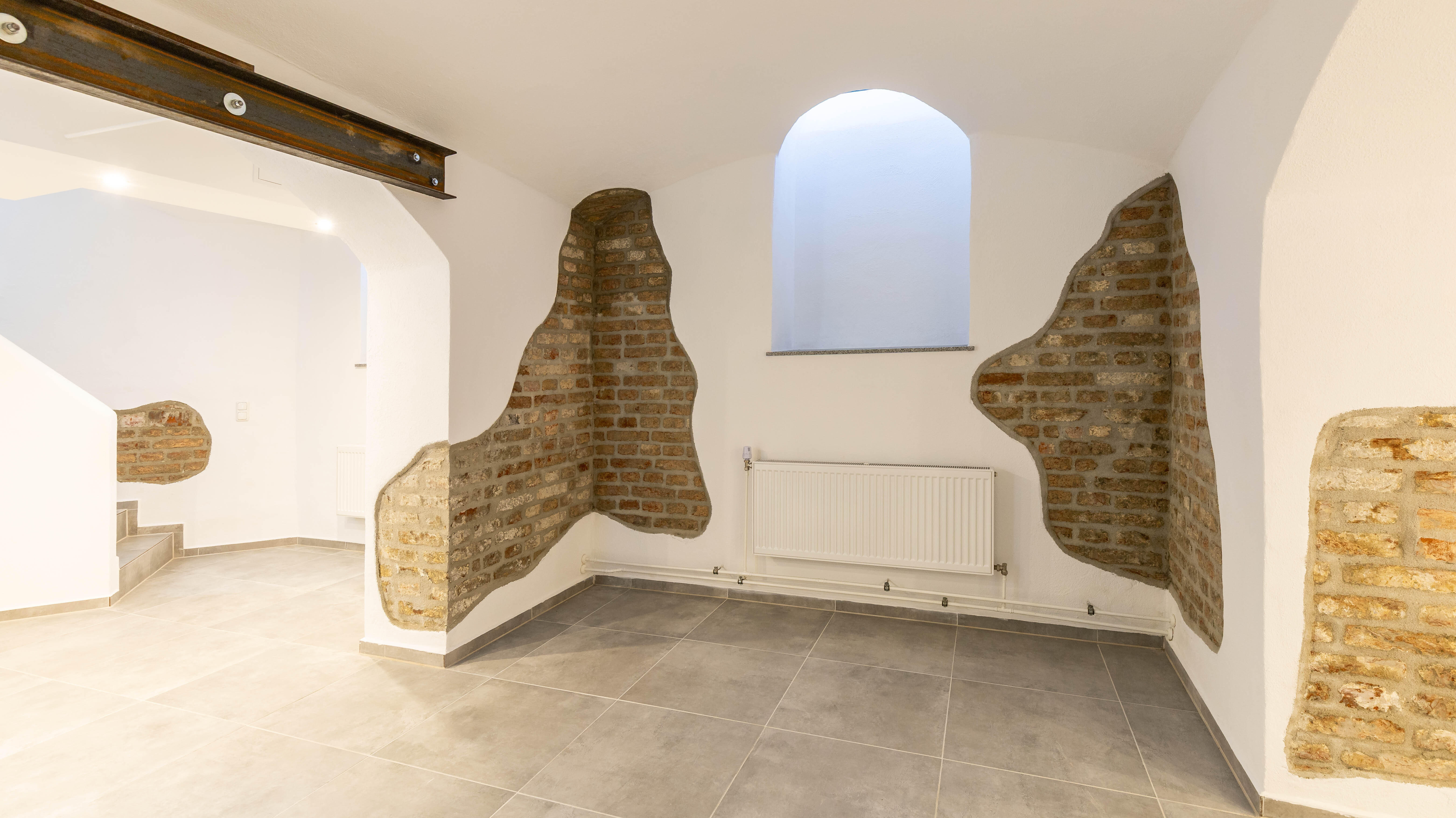 Die Maisonette-Einheit überzeugt durch Modernität in historischem Mauerwerk. Attraktive Baudetails vergangener Zeiten, wie das Mauerwerk aus der Zeit um 1900, wie genietete Stahlträgerelemente, wurden an einigen Stellen bewusst sichtbar gelassen, um die Materialästhetik wirken zu lassen. Ein ästhetisch ansprechender Parkettboden liegt sowohl im Schlafzimmer als auch im großzügigen Wohnzimmer, das über eine Innentreppe mit dem Gewölbekeller im Untergeschoss verbunden ist. Der Treppenabgang kann durch einen maßgefertigten Stahlrahmen mit elektronisch gesteuertem Glasboden verschlossen werden. Das Duschbadezimmer verfügt über eine Fußbodenheizung, die anderen Räume sind mit Heizkörpern ausgestattet.