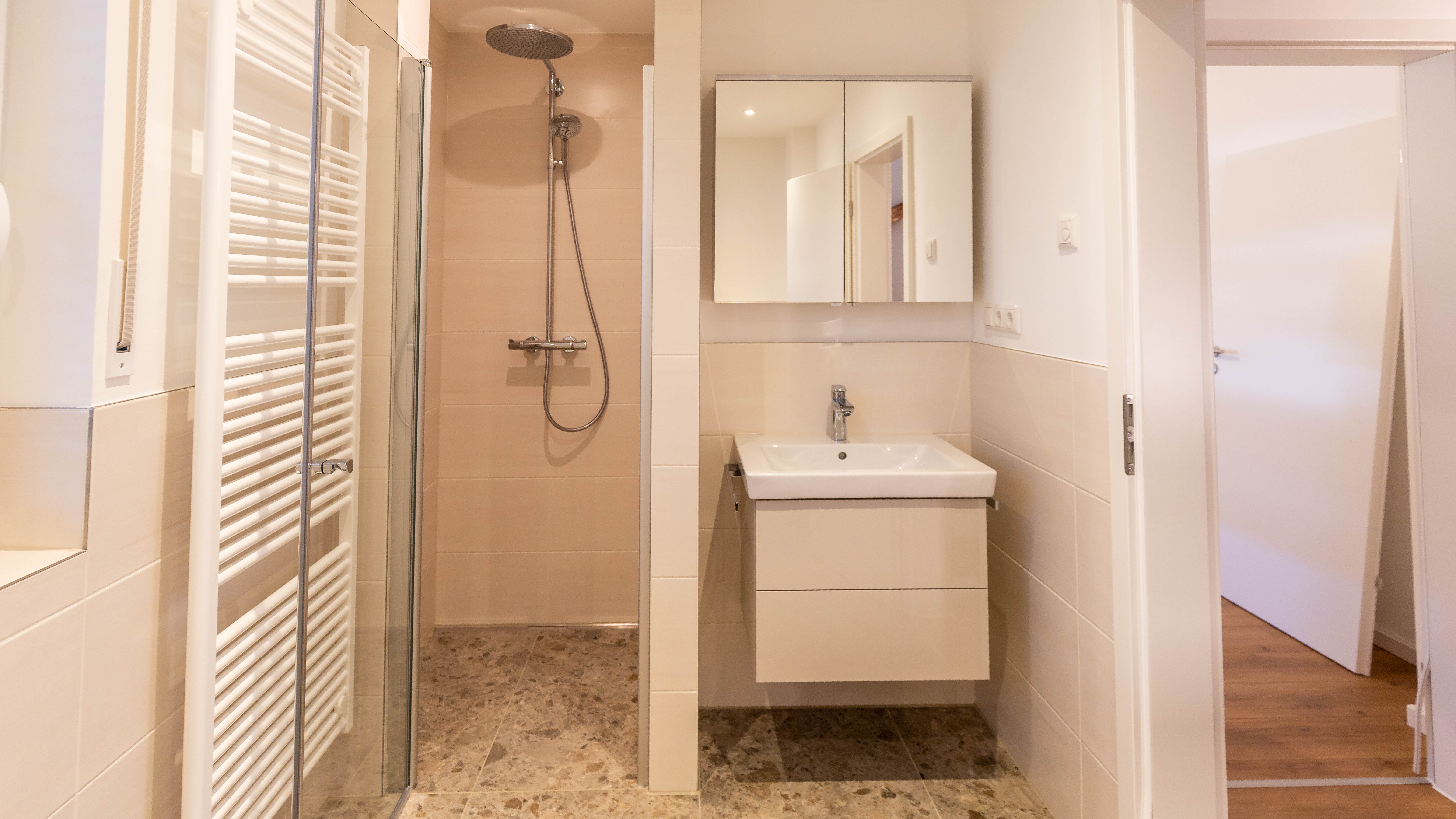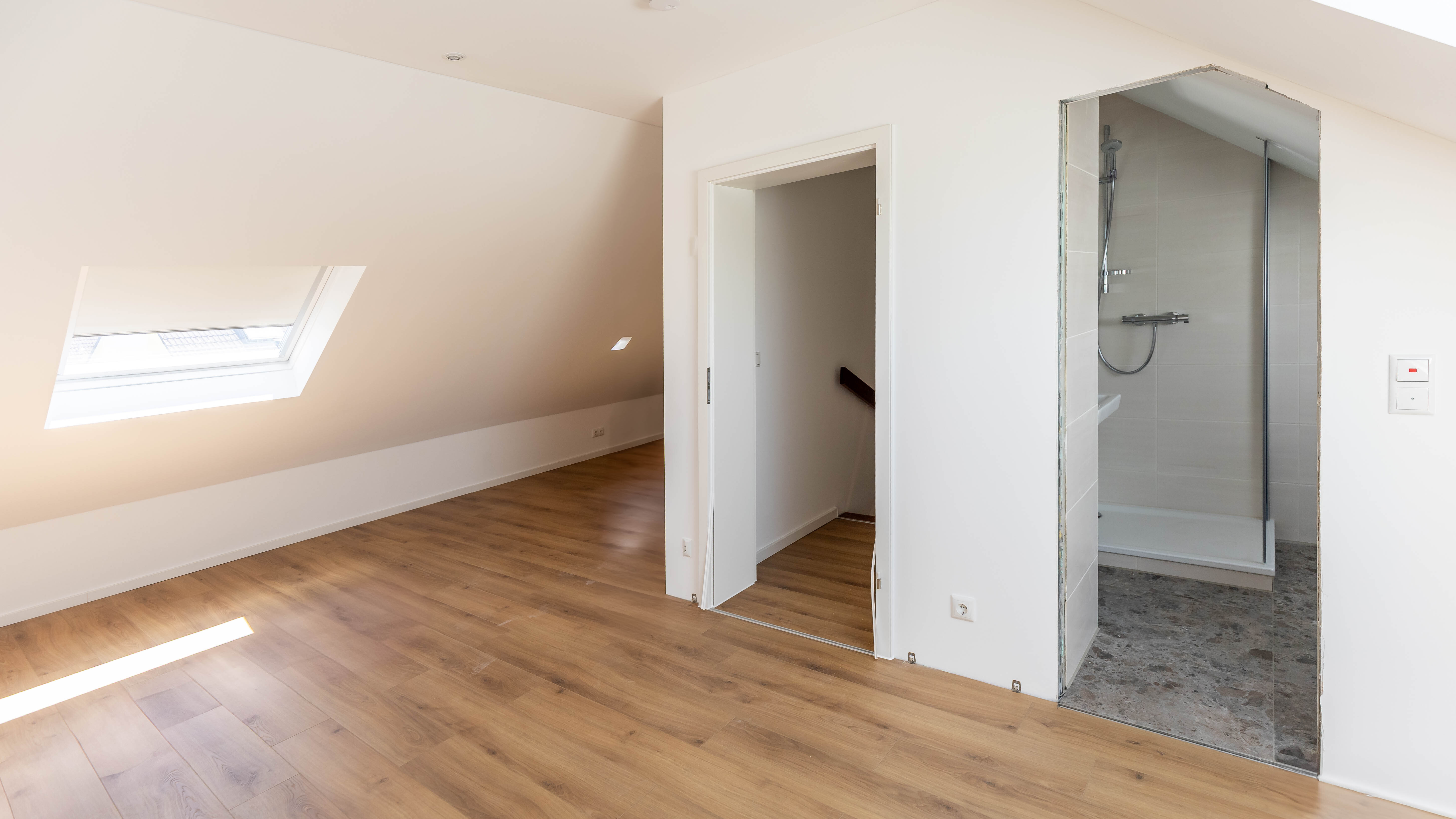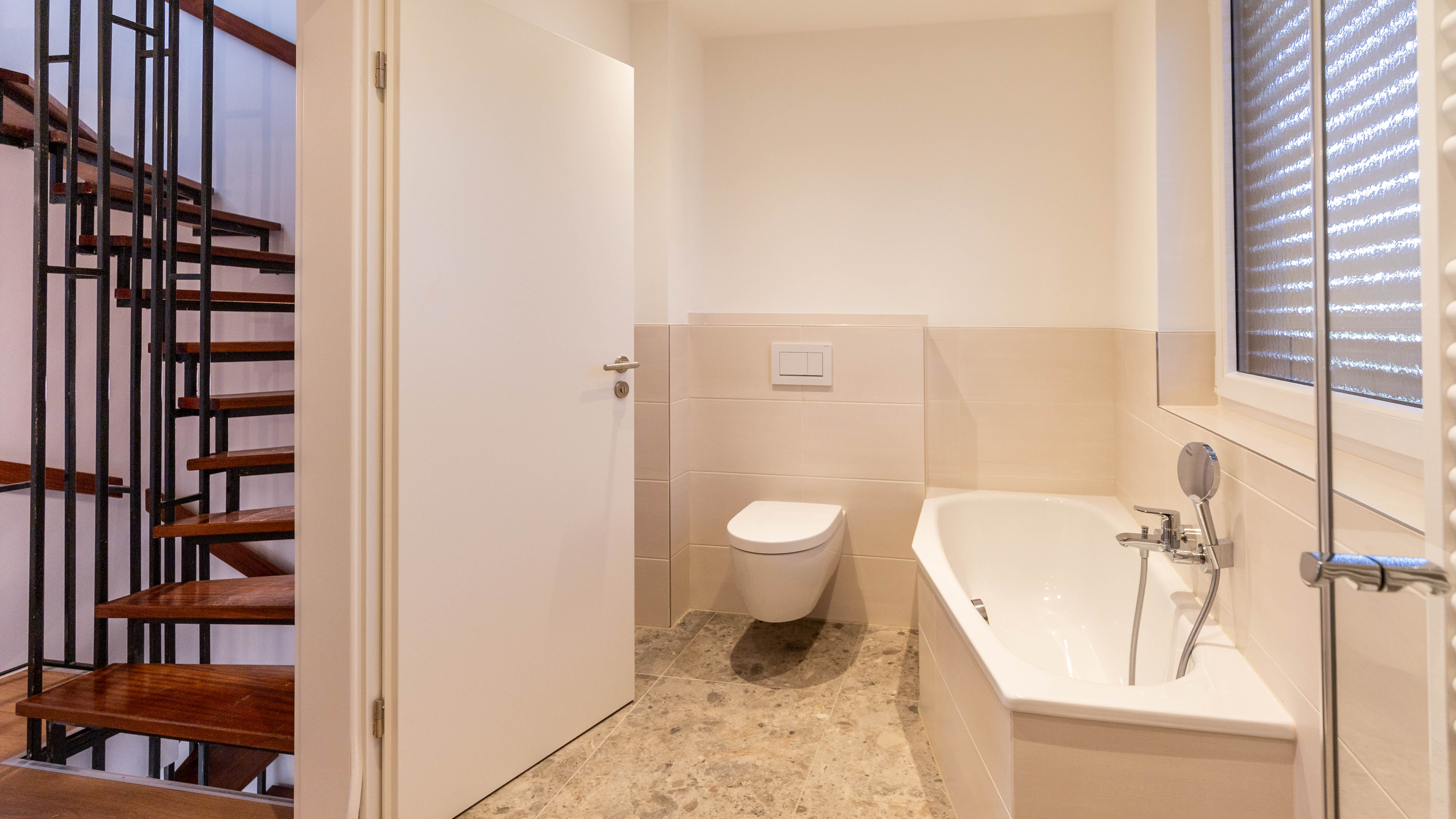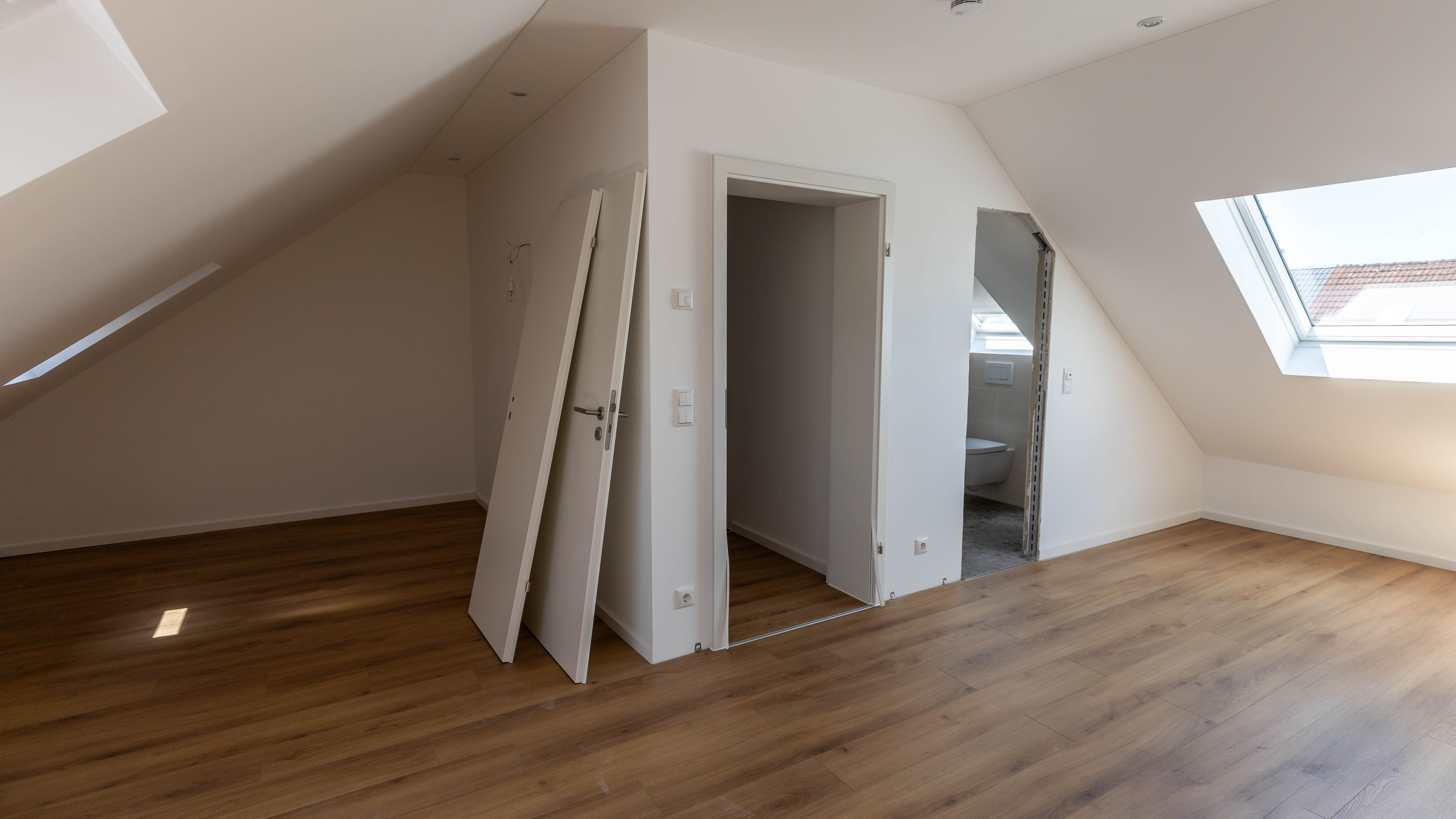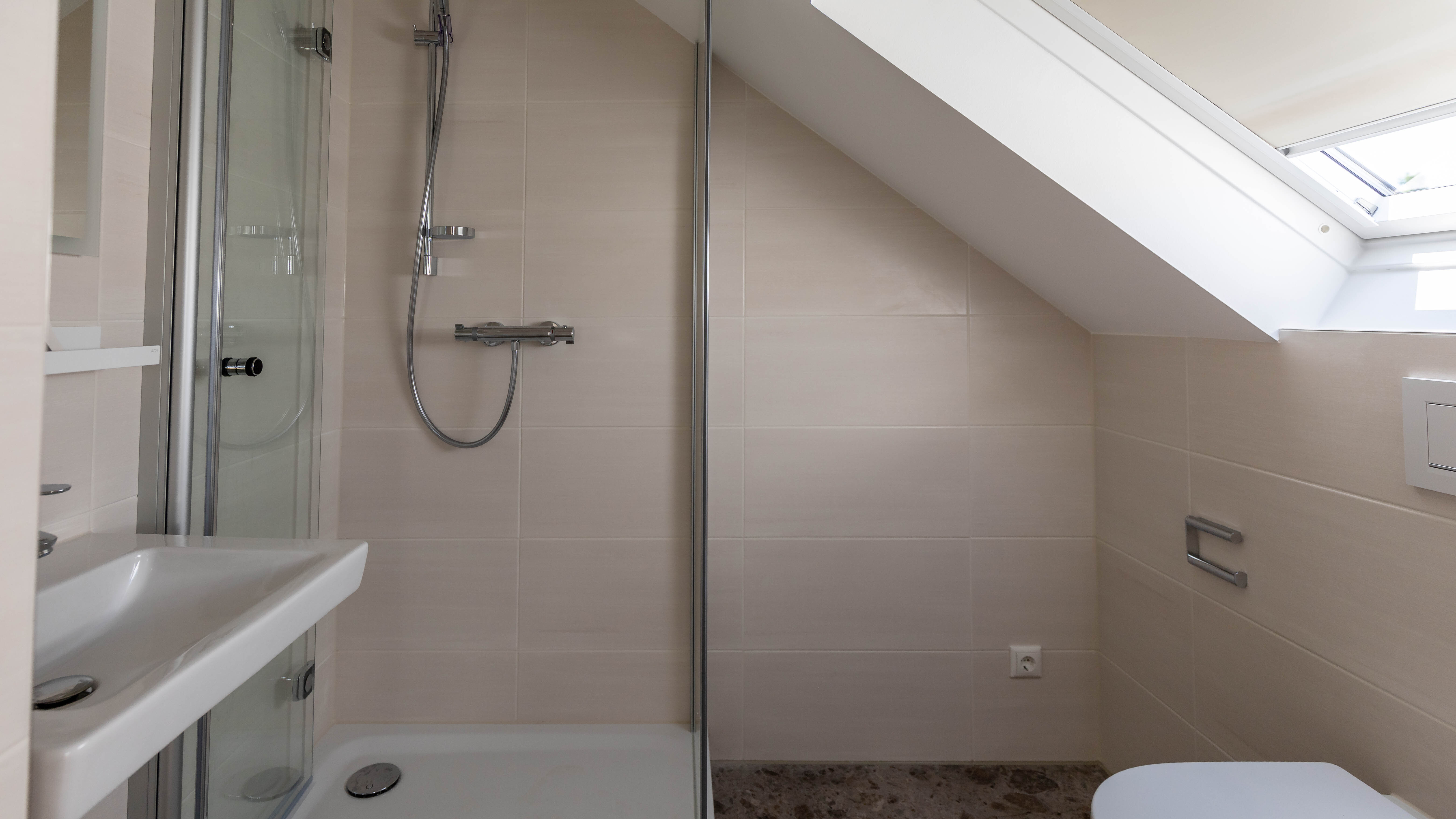 Die beiden neu gestalteten Bäder bieten zeitgemäßen Komfort: Das Hauptbadezimmer verfügt über WC, Dusche und Badewanne, das Bad im Dachgeschoss ist mit einer Dusche und WC ausgestattet. Ein zusätzliches Gäste-WC rundet das Angebot ab. Bei den Fenstern wurden einige im Zuge der Sanierung erneuert, die übrigen wurden bereits einmal ausgetauscht.