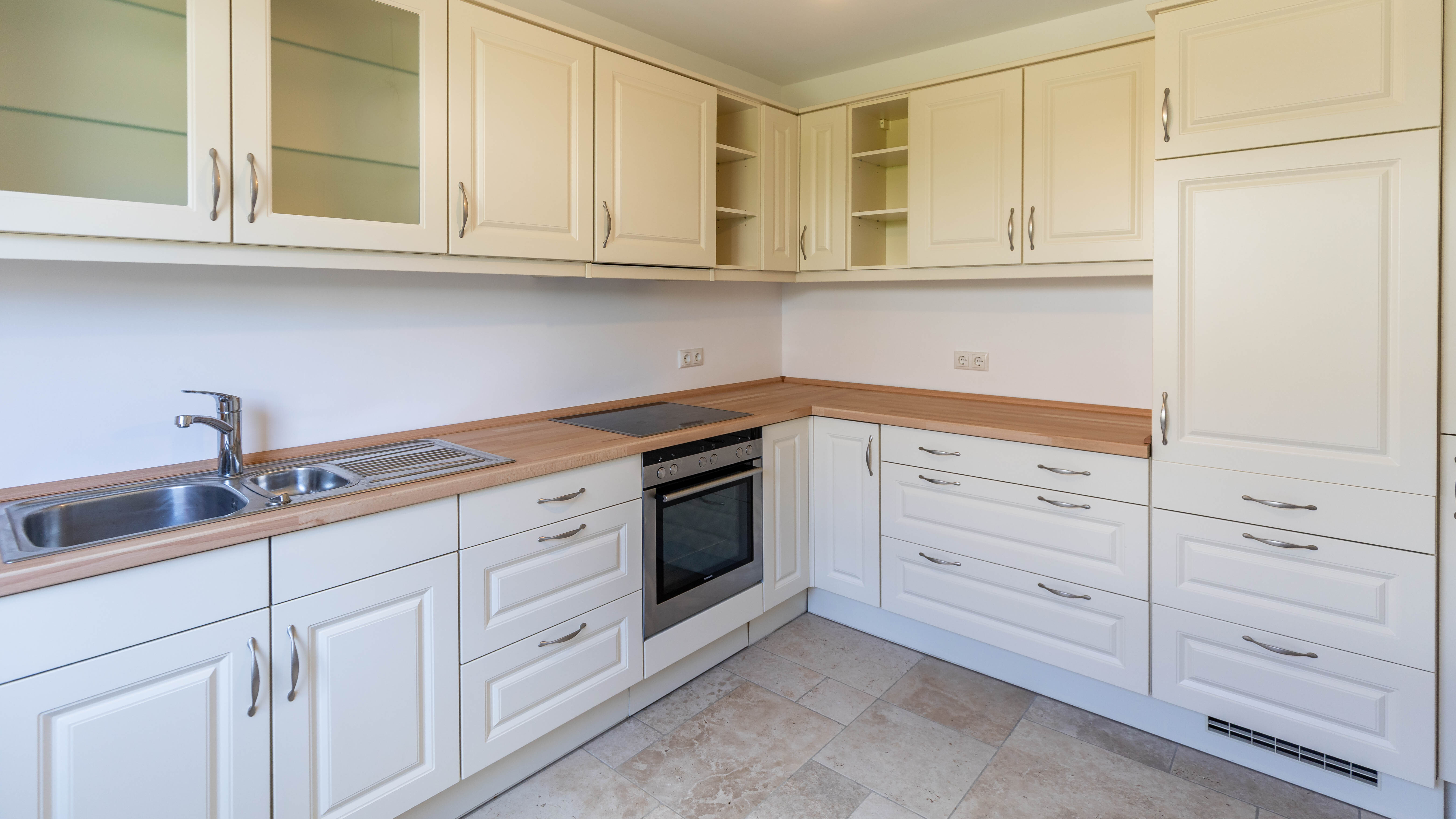 Die gepflegte Einbauküche ist wenig genutzt worden, befindet sich in sehr gutem Zustand und ist mit Markengeräten (Backofen, Kochfeld und Kühlschrank) von Siemens ausgestattet.