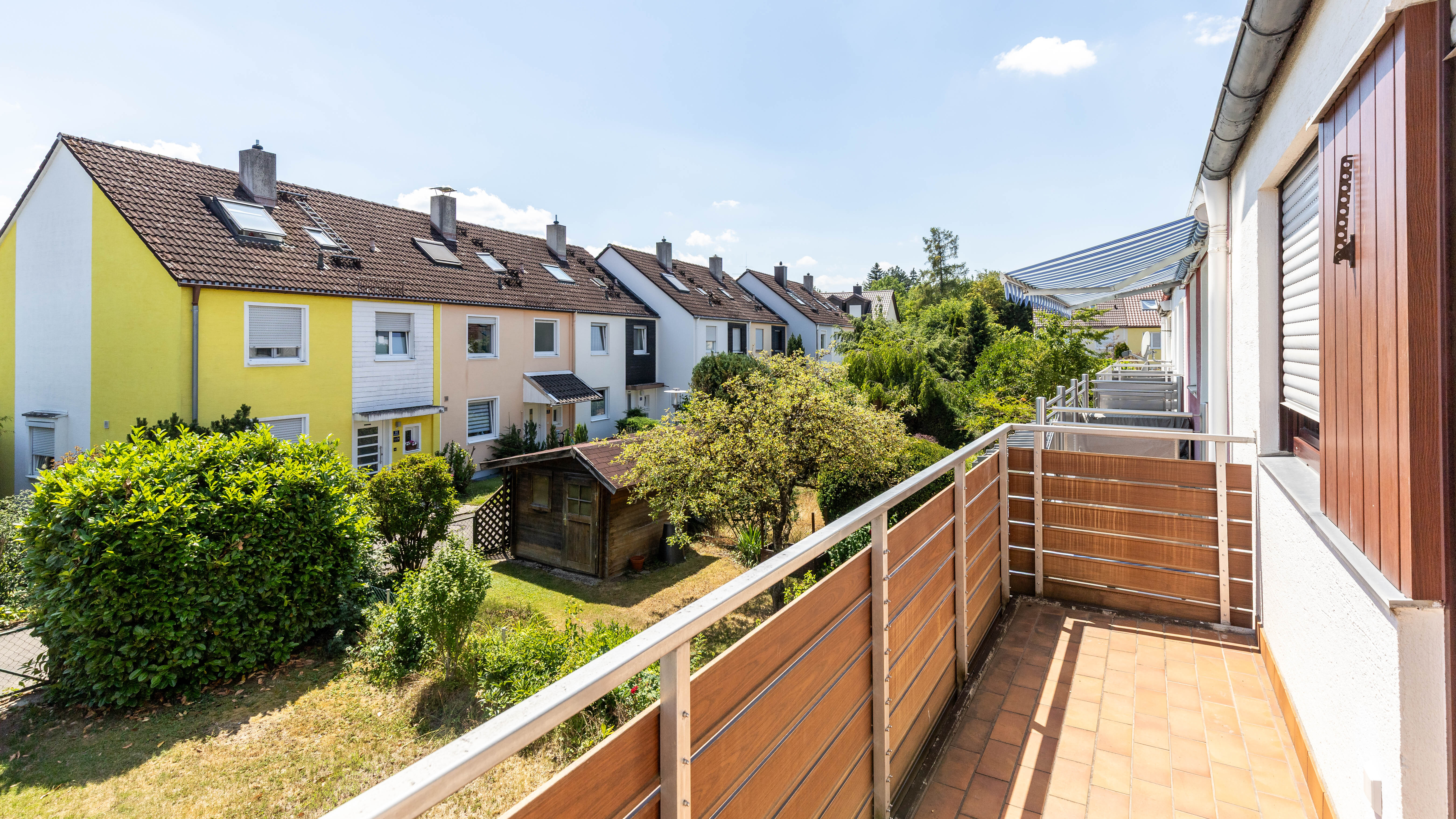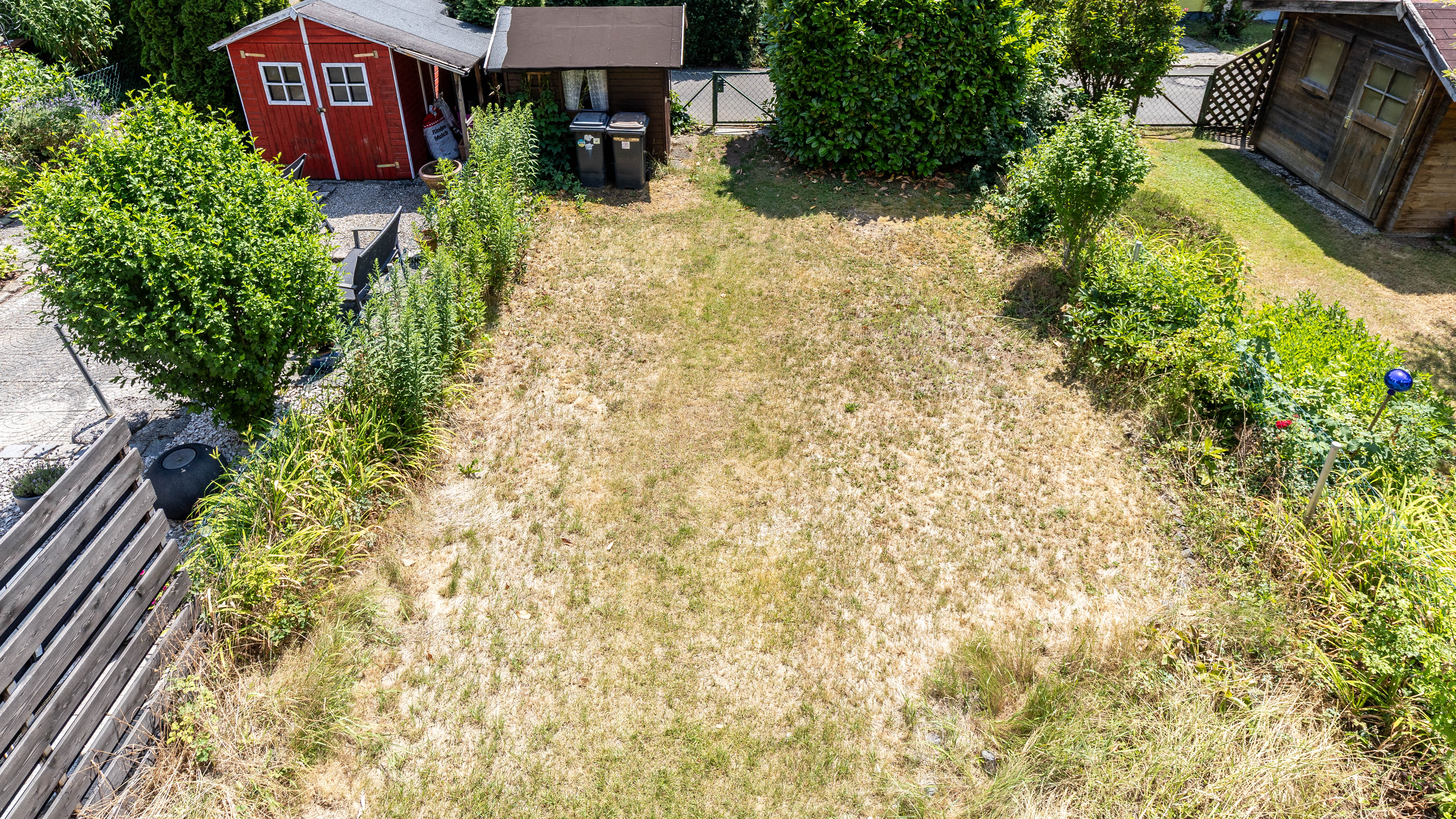 Der Garten mit kleinem Gartenhaus bietet Raum für Freizeit, Entspannung und Hobbys. Eine Terrasse mit Markise lädt zu gemütlichen Stunden im Freien ein.