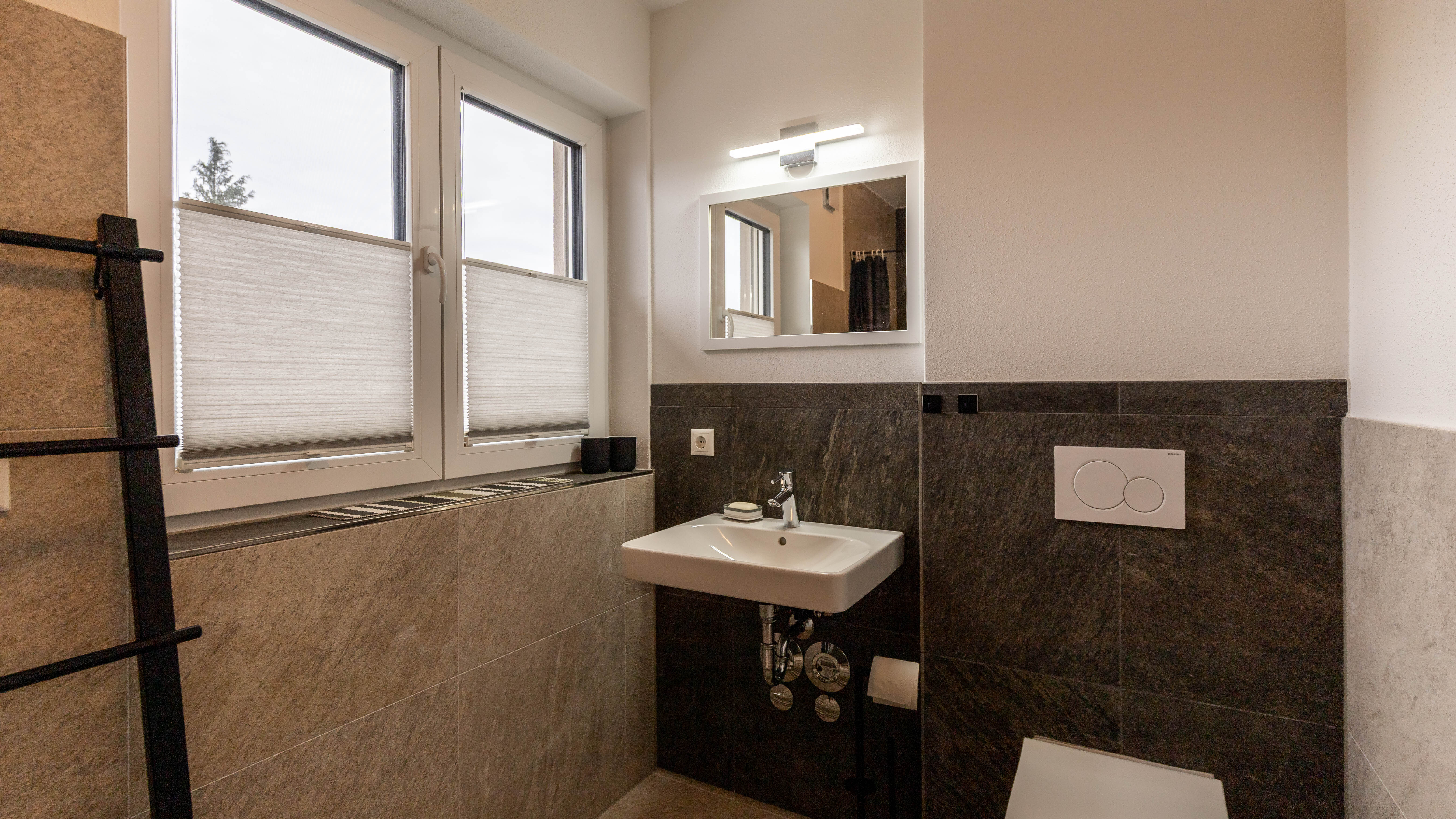 Das Badezimmer ist mit Dusche, WC, Waschbecken und Waschtrockner ausgestattet.