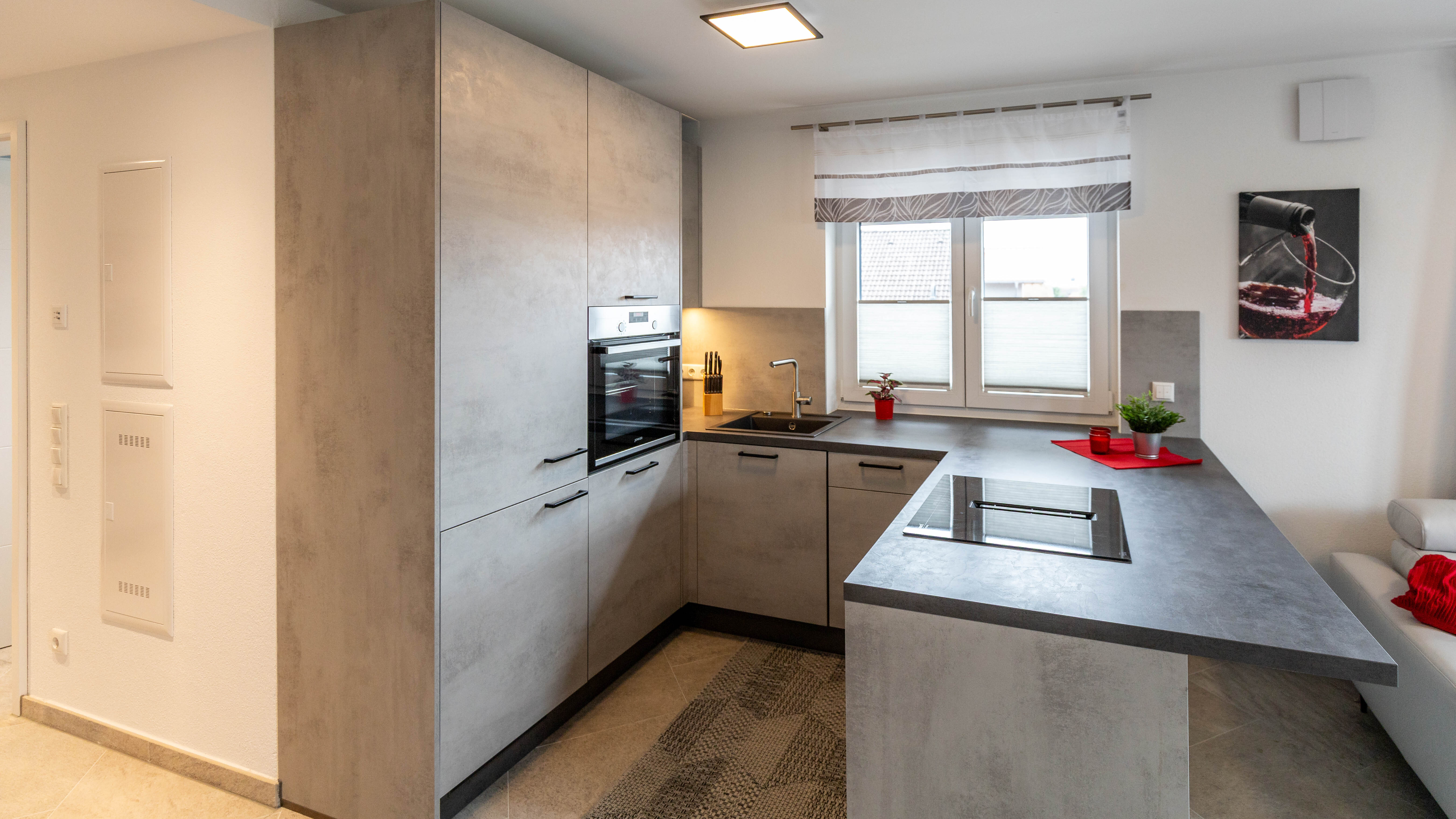 Die Einbauküche (Dross & Schaffer) ist mit einem Pyrolyse-Backofen, einer Kühl-Gefrierkombination sowie einer Geschirrspülmaschine ausgestattet.
