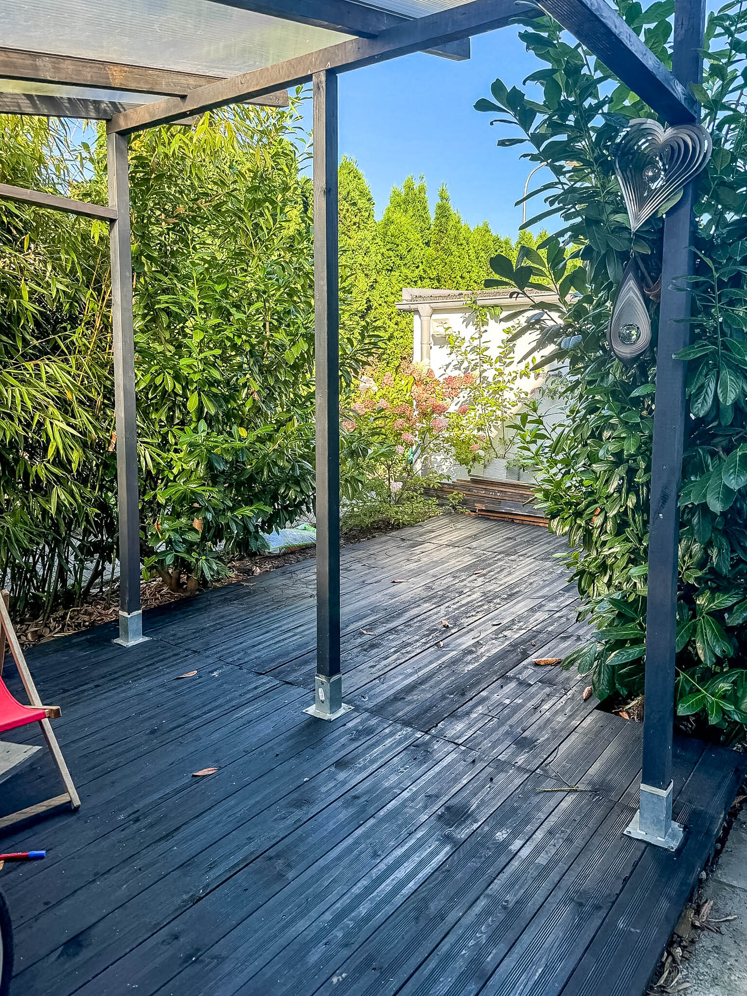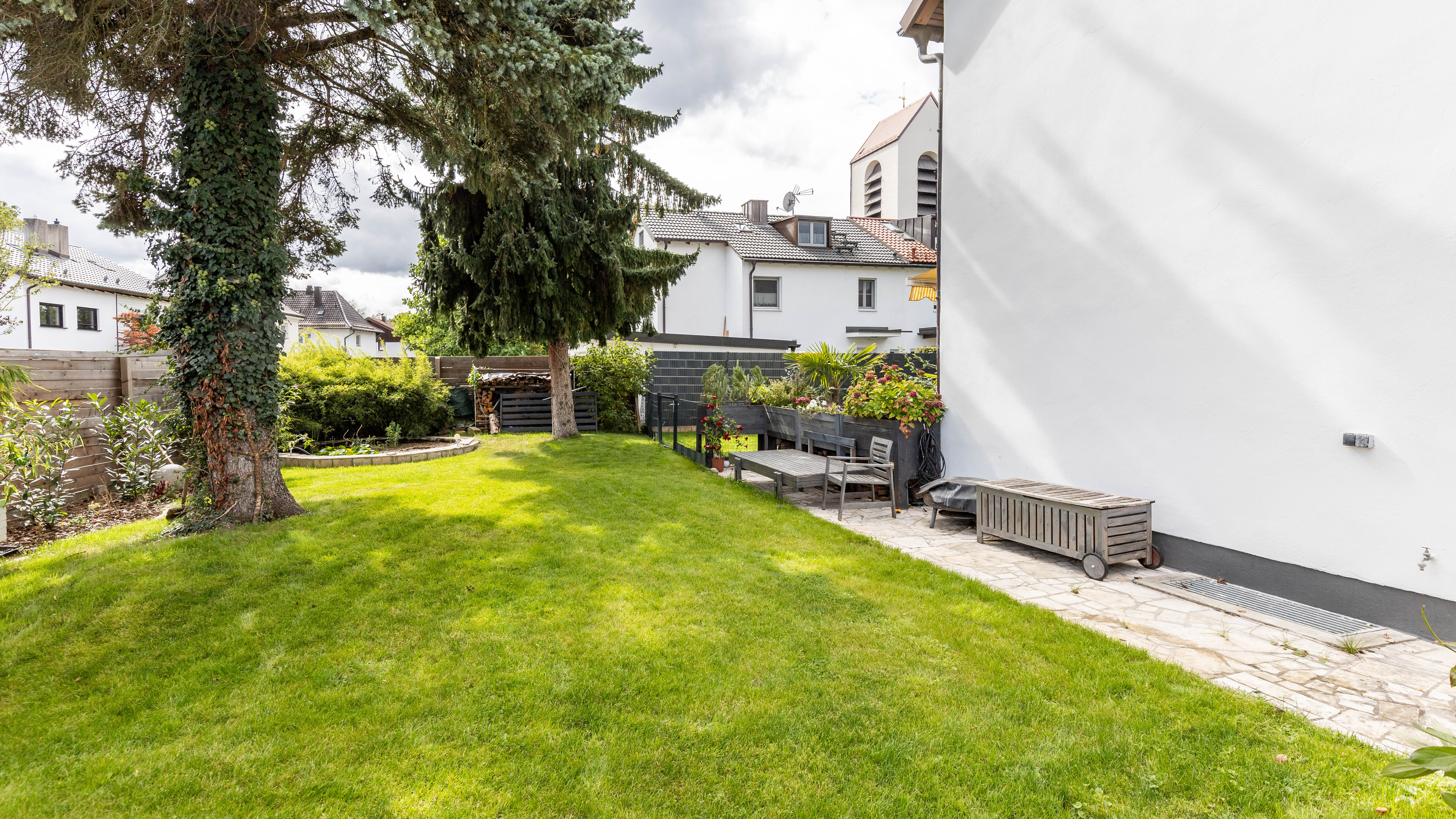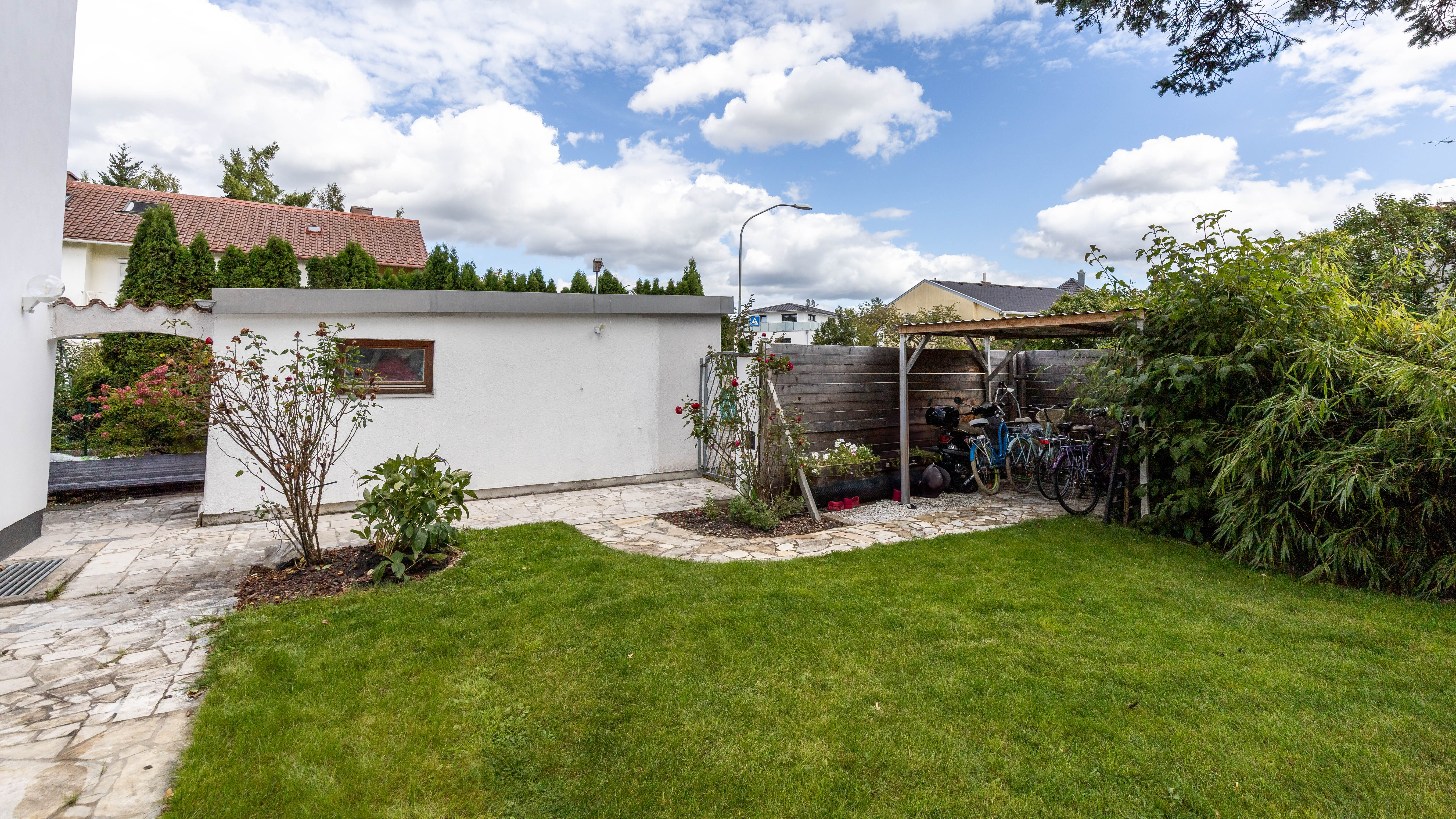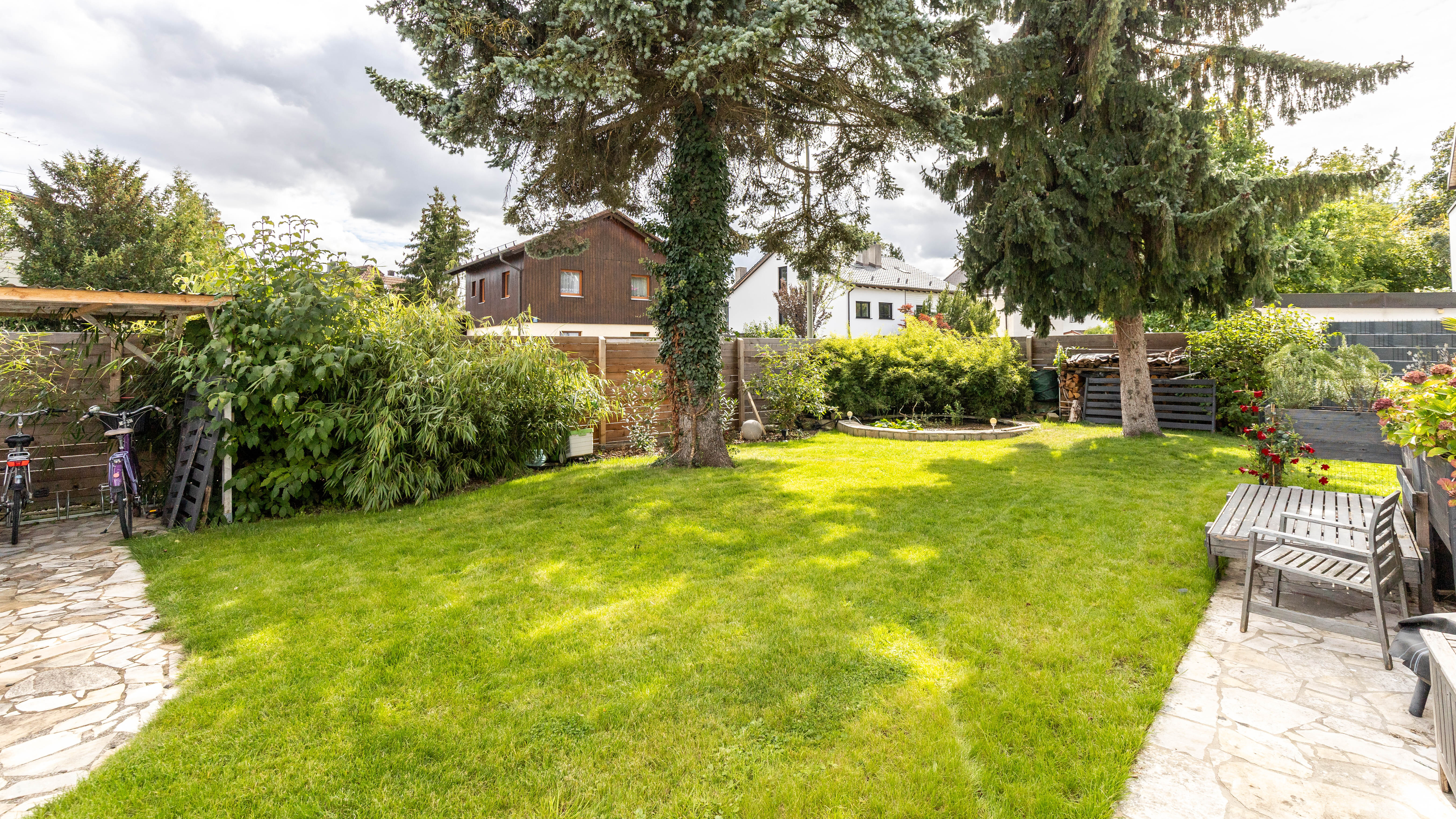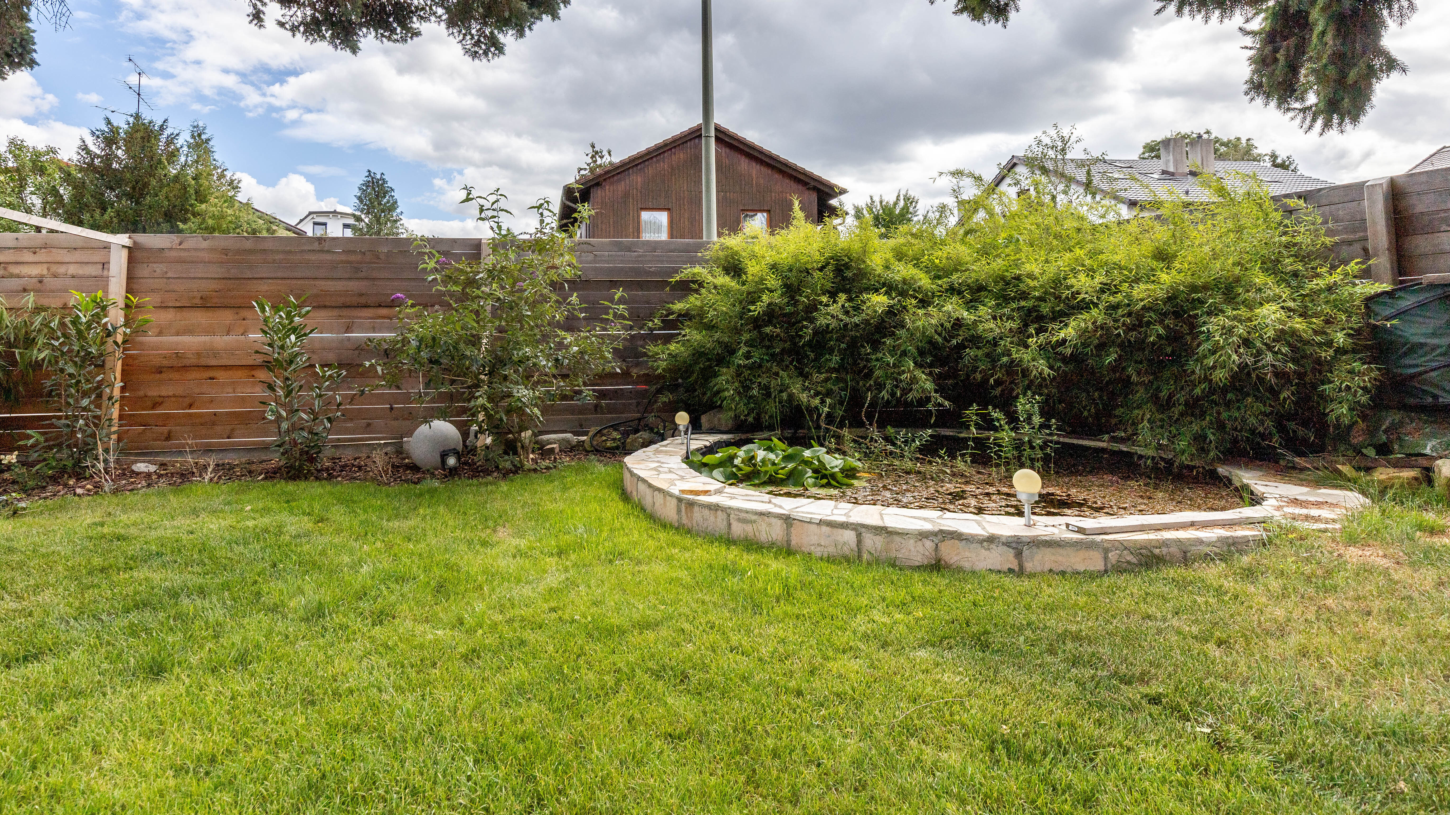 Das über 400 qm große Grundstück mit zwei großen Terrassen und überdachtem Fahrradstellplatz sowie einem neu angelegten Teich bietet vielfältige Gestaltungsmöglichkeiten und Frei-Raum für die ganze Familie.