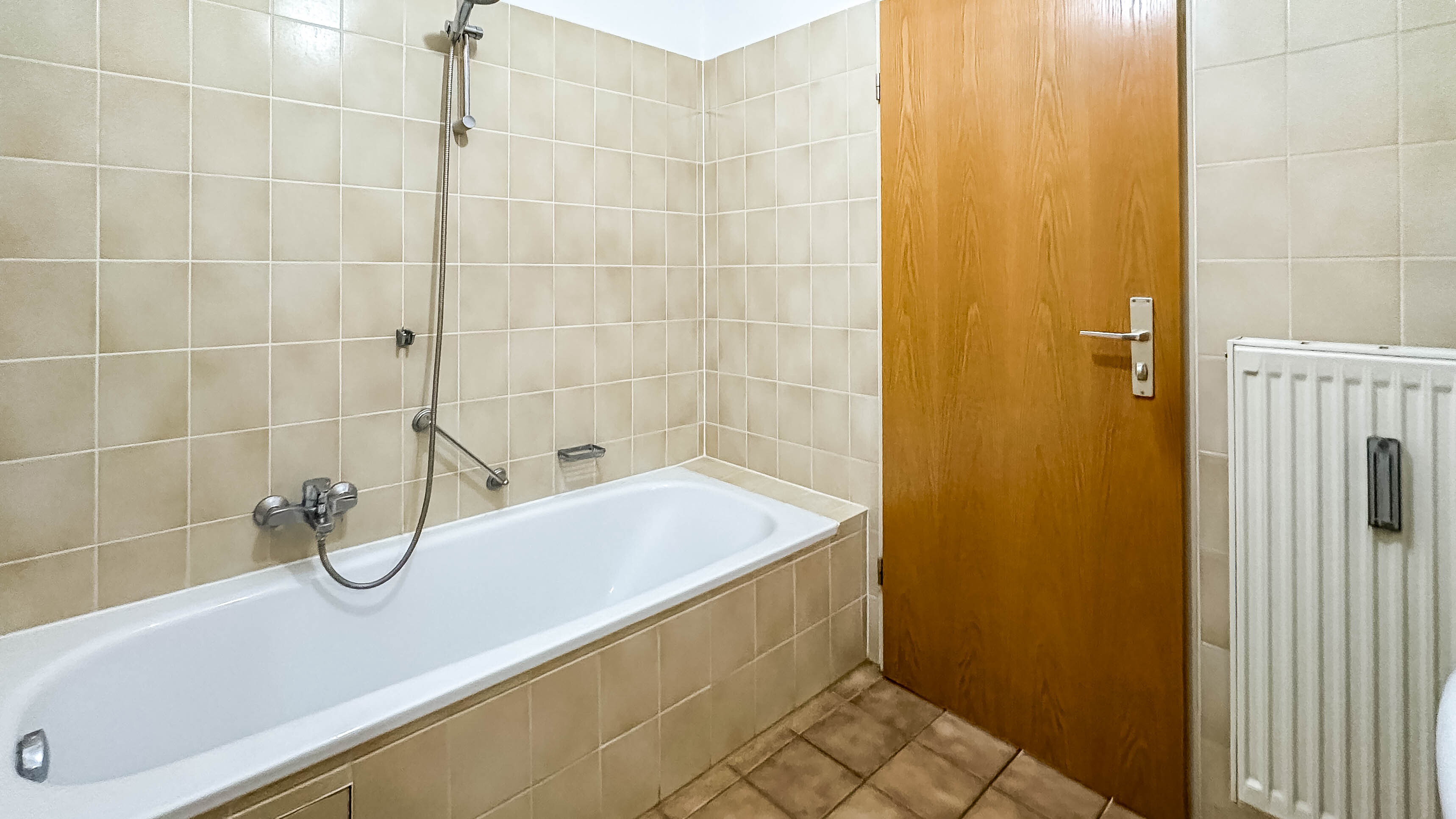 Im gut geschnittenen Schlafzimmer wie auch Wohnzimmer ist Mosaikparkettboden verlegt. Das innenliegende Badezimmer mit WC, Waschbecken und Badewanne mit Duschvorrichtung ist gefliest. Ebenso pflegeleichten wie auch strapazierfähigen Fliesenboden gibt es auch im Flur.