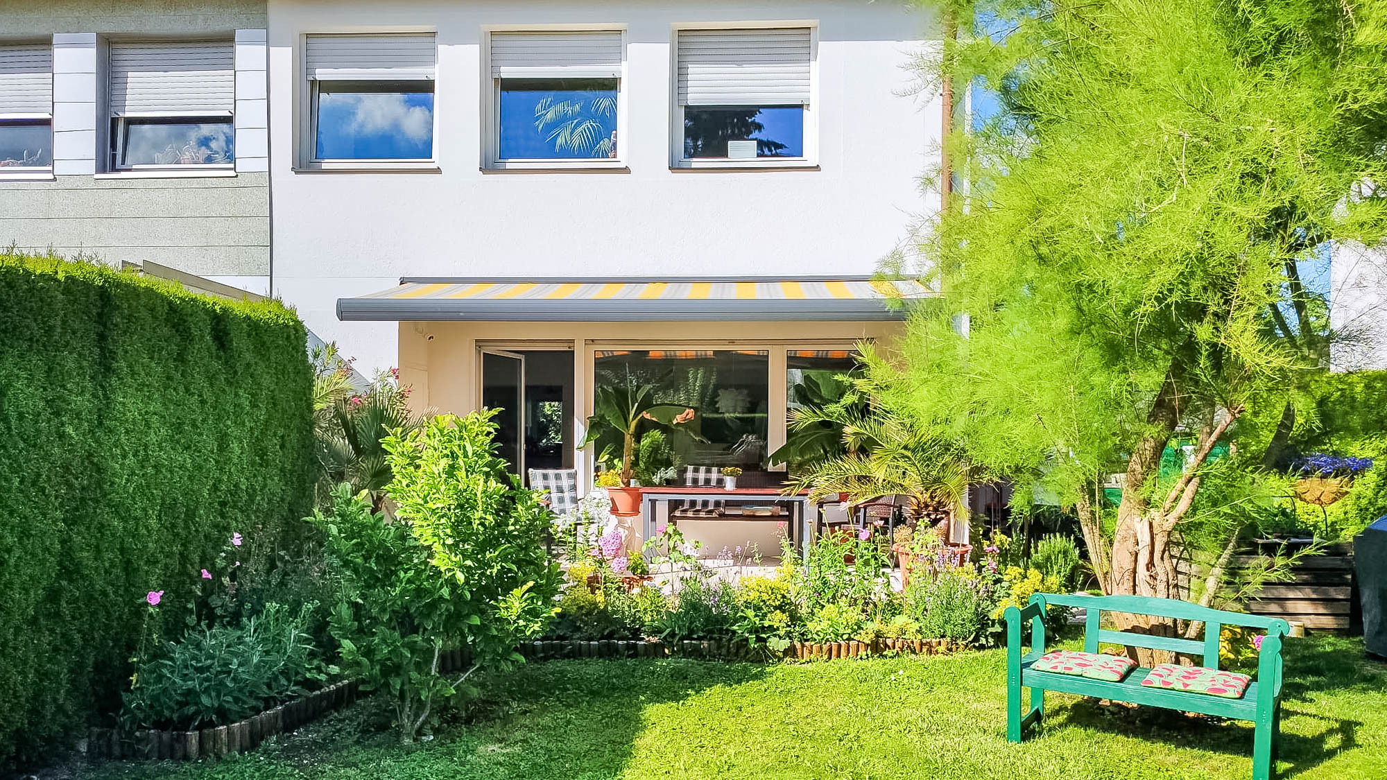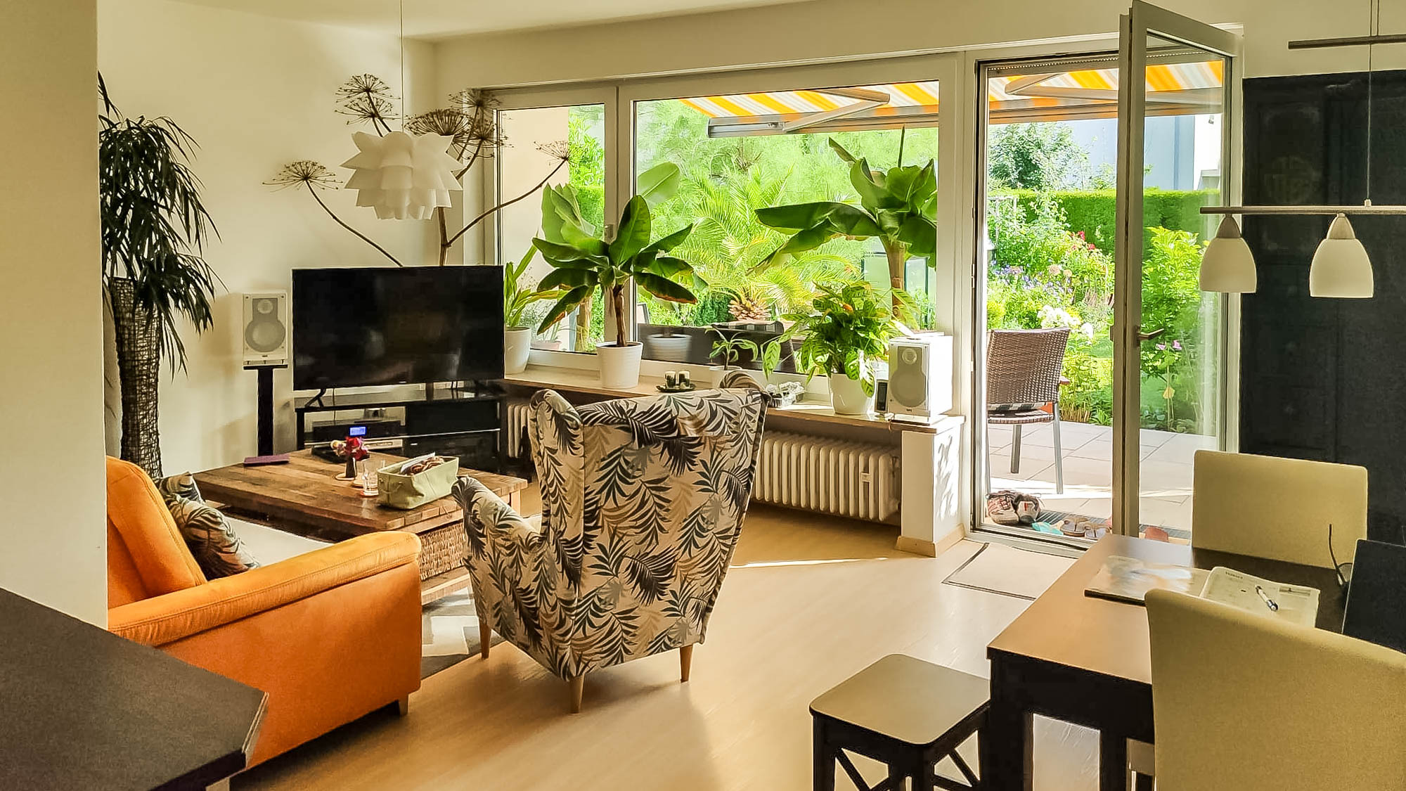 Der Übergang in das helle Wohnzimmer erfolgt fließend und schafft ein offenes, luftiges Wohnambiente. Eine große Fensterfront lässt viel Tageslicht herein und bietet einen schönen Blick in den liebevoll gepflegten Garten. Von hier aus gelangen Sie direkt auf die Terrasse und in den sonnigen, südwestlich ausgerichteten Außenbereich.