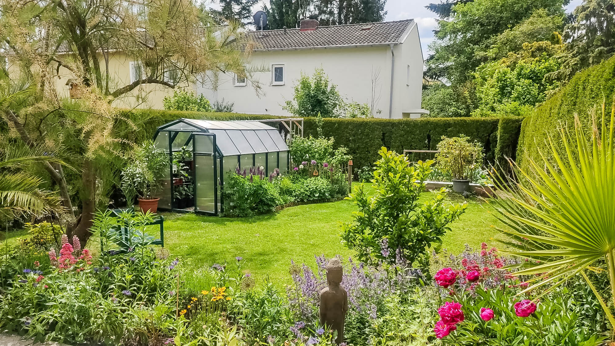Der Garten wurde von den bisherigen Mietern mit großer Sorgfalt gepflegt und bietet Gartenfreunden besondere Extras: Ein mieterseitig errichtetes Gewächshaus ermöglicht die Anzucht von Gemüse und Kräutern, während ein praktischer Geräteschuppen zusätzlichen Stauraum für Gartengeräte schafft.