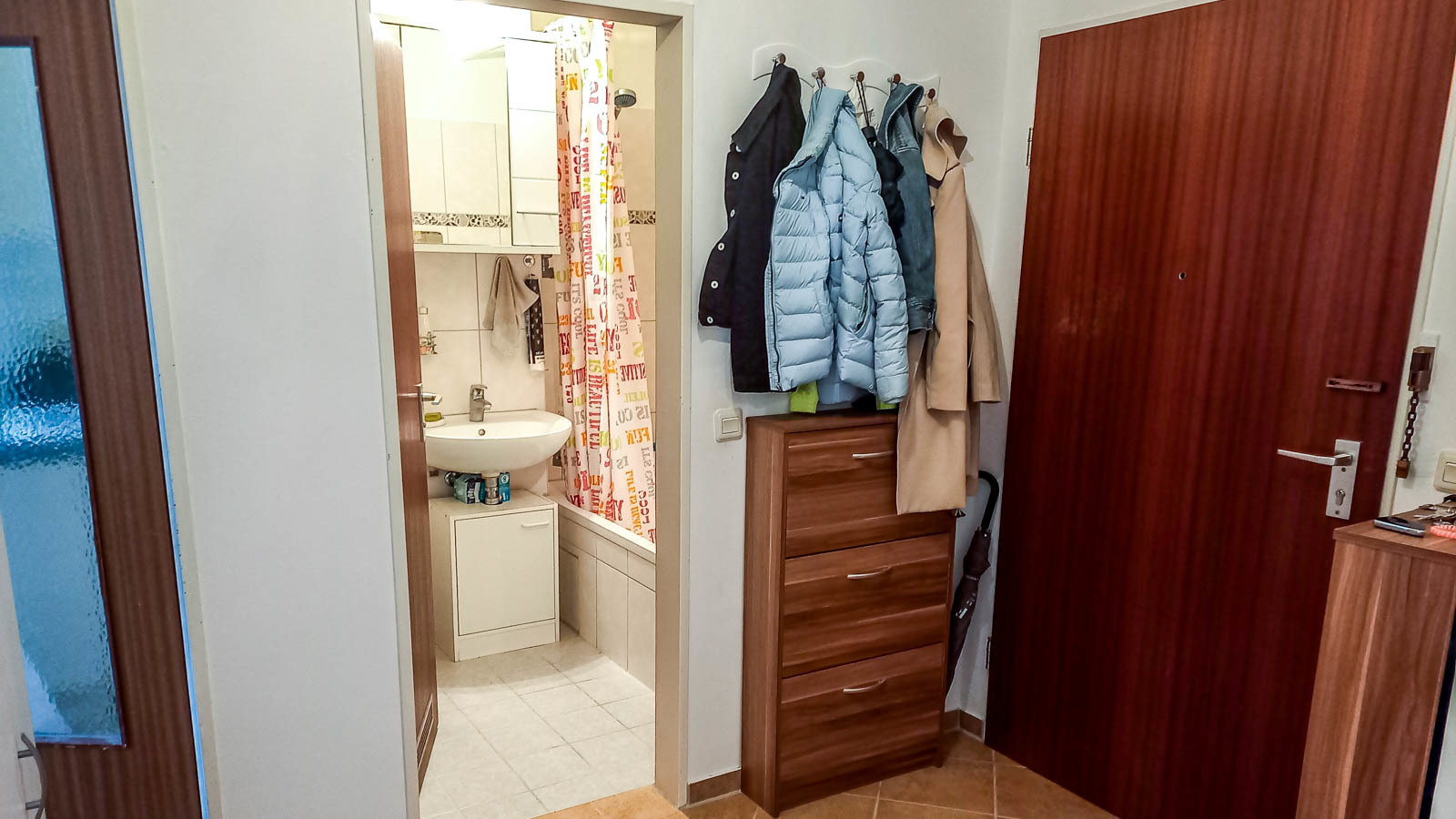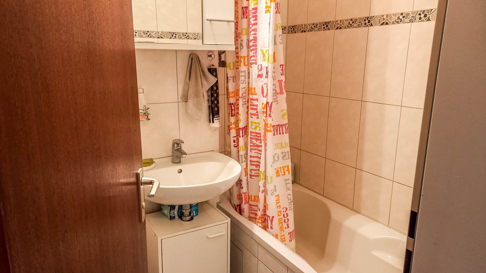 Der kombinierte Wohn- und Schlafbereich ist mit Laminat, die geräumige Diele mit Terracottafliesen und das innenliegende Badezimmer mit WC, Handwaschbecken und Badewanne mit hellen Boden- und Wandfliesen versehen.