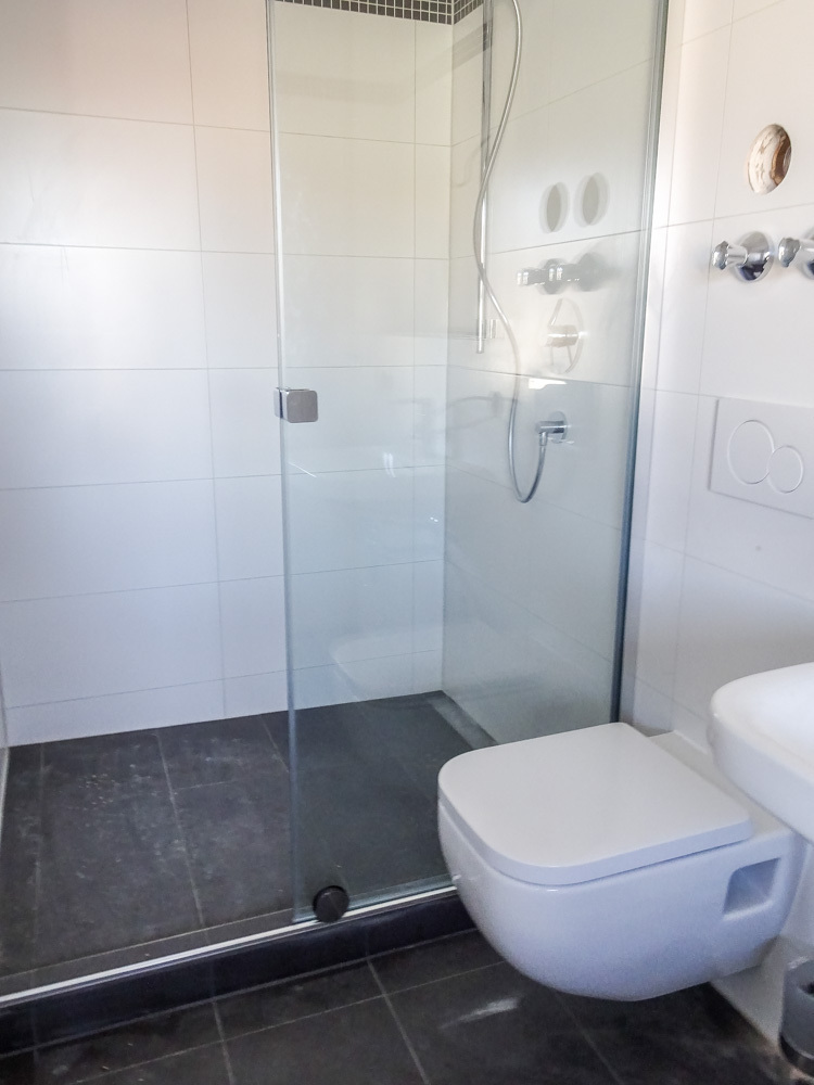 Das Badezimmer ist mit einer bodentiefen Dusche, einem WC und einem Waschbecken ausgestattet. Ein Waschmaschinenanschluss ist ebenfalls vorhanden.