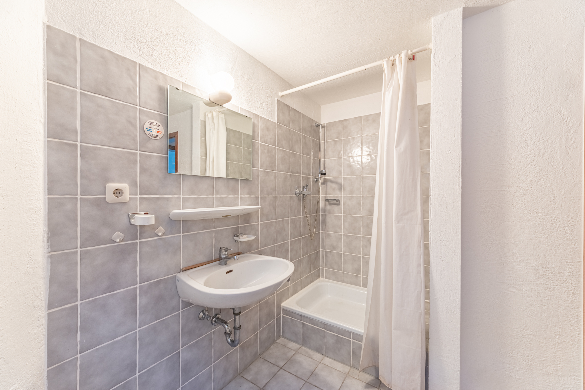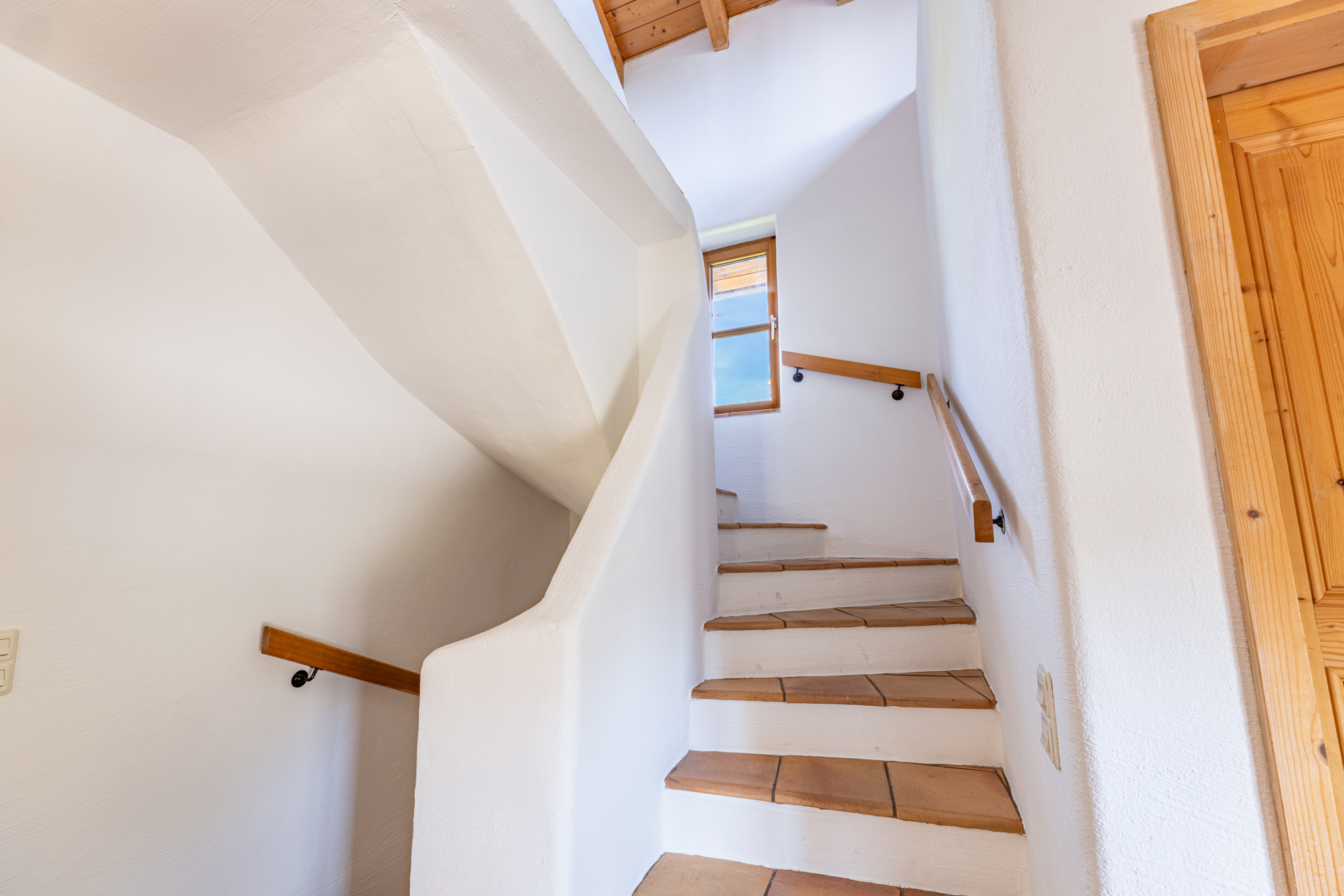 Über eine gemauerte Innentreppe gelangt man in die erste und somit oberste Etage. Dort stehen ein wunderbares lichtvolles Studio mit großem langegezogenen Balkon, ein kleines Schlaf- bzw. Kinderzimmer, eine alltagspraktisch große Abstellkammer und ein Tageslicht-Familienbad mit Dusche und Badewanne zur Verfügung.