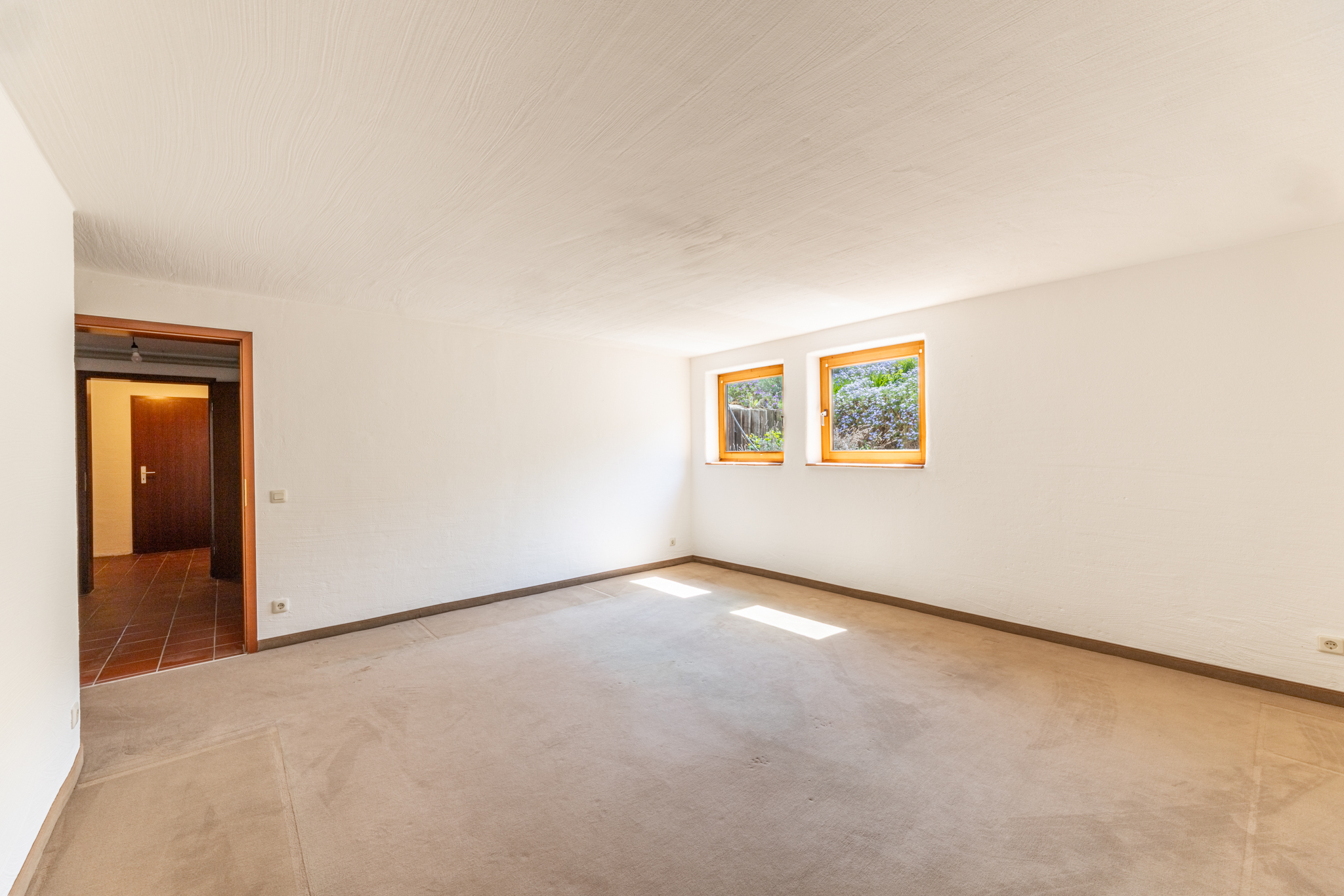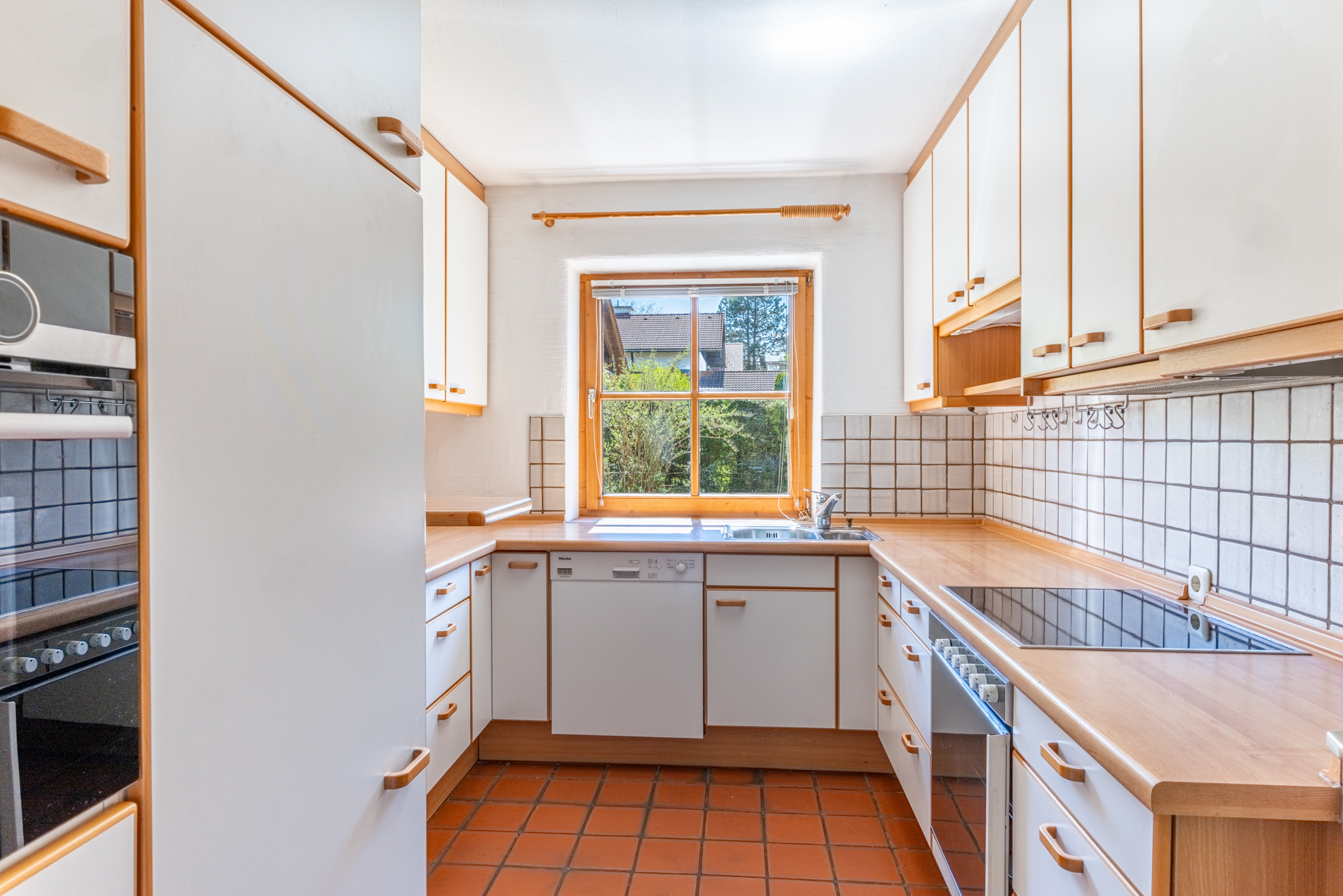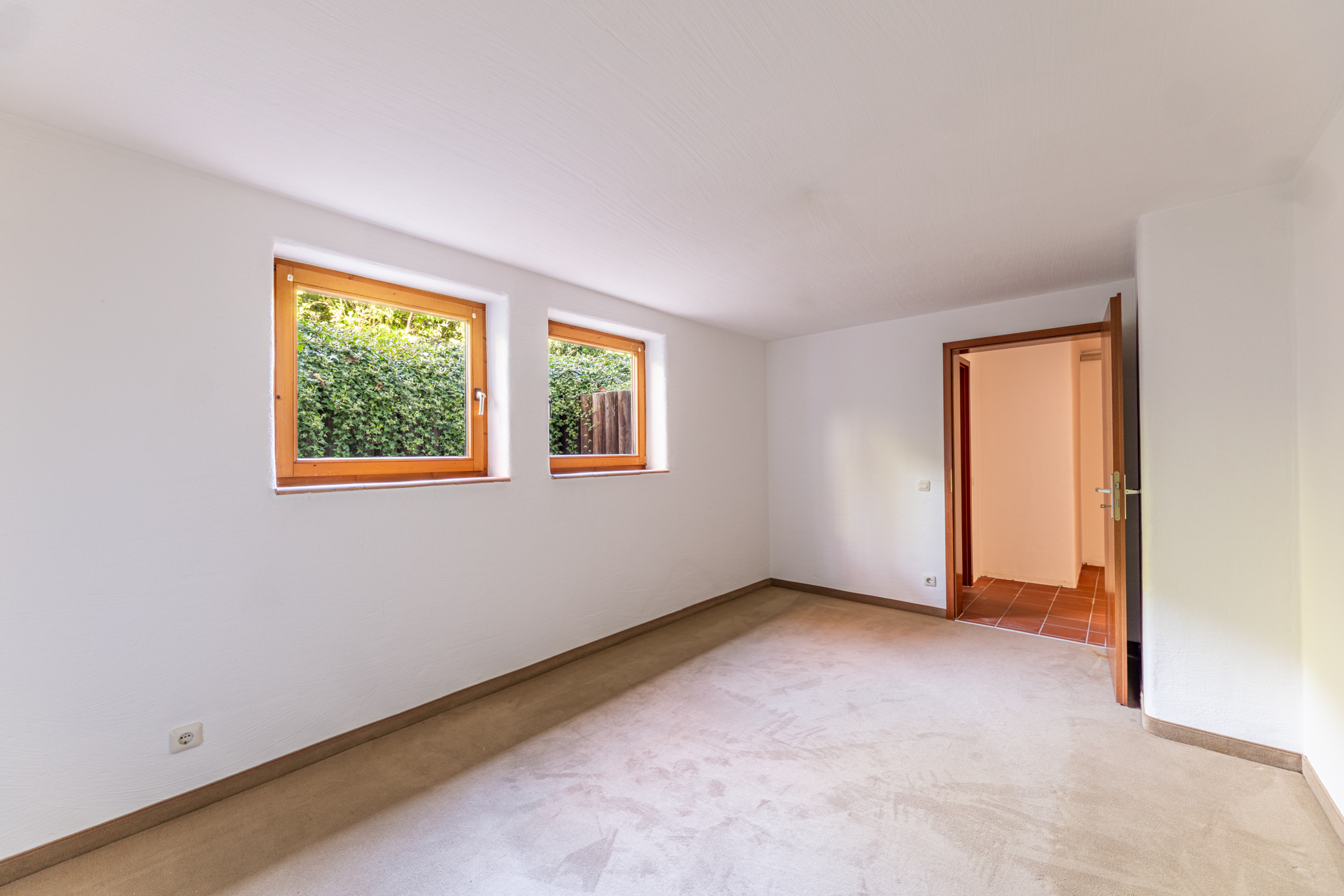 Die funktionsfähige Almo-Küche ist im Kaufpreis eingeschlossen. Das kleine südseitige Zimmer besitzt ebenfalls Zugang zu Terrasse und Garten.