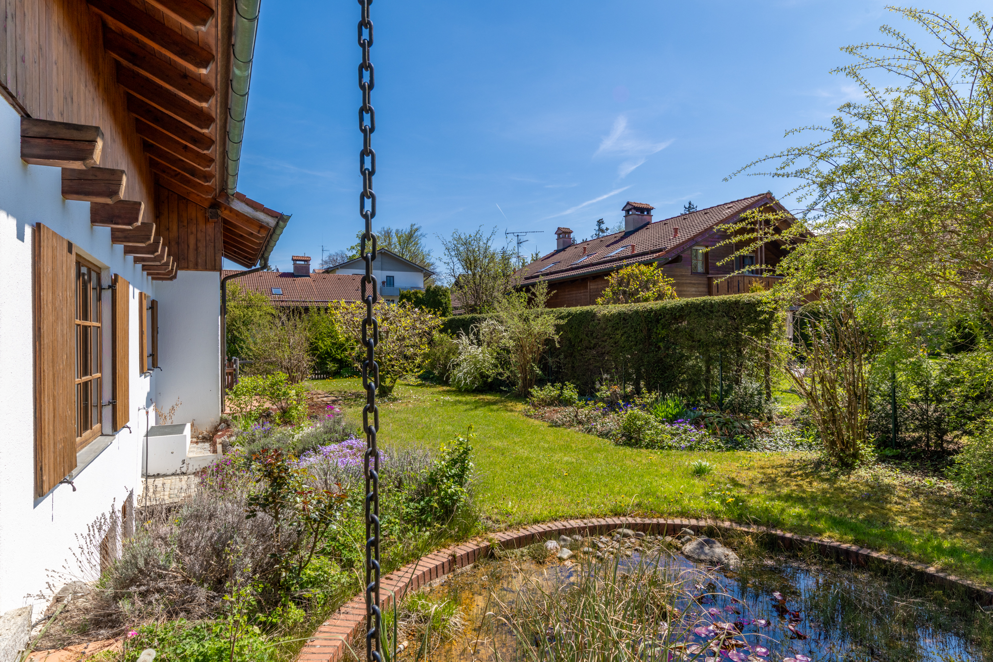 Das Familienrefugium überzeugt durch die attraktive Raumaufteilung und den schön gestalteten Garten mit Bäumen, heimischen Stauden und einem kleinen Teich.