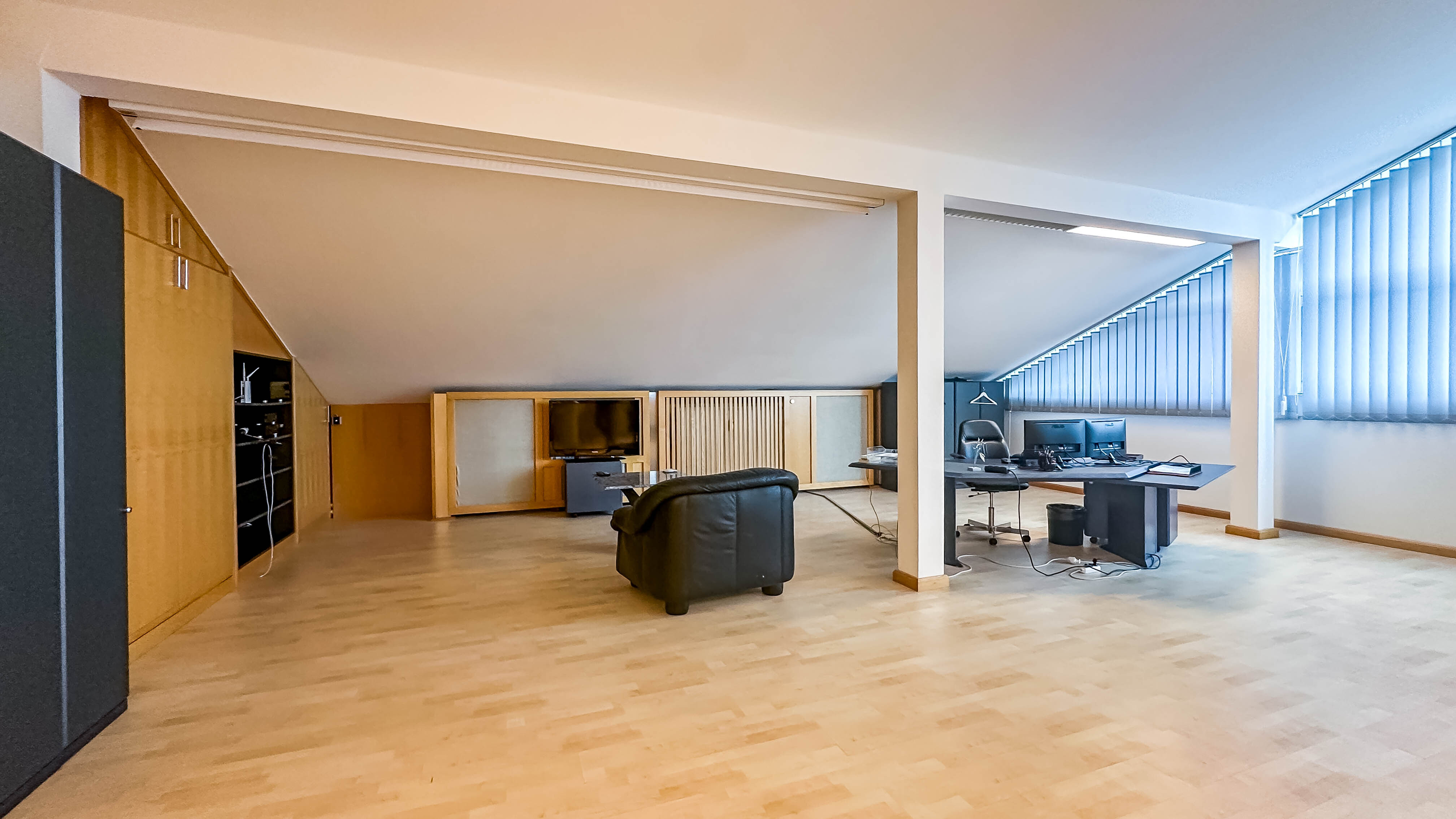 Diese gepflegte Gewerbeeinheit im Dachgeschoss eines repräsentativen Geschäftshauses bietet durch ihre großzügige Raumgestaltung vielseitige Nutzungsmöglichkeiten. Der offen geschnittene Hauptraum wirkt durch die großen Fensterflächen, die viel Tageslicht hereinlassen, besonders freundlich und einladend. Die Dachschrägen verleihen der Einheit einen individuellen Charakter, während der helle Laminatboden eine angenehme Arbeitsatmosphäre schafft.