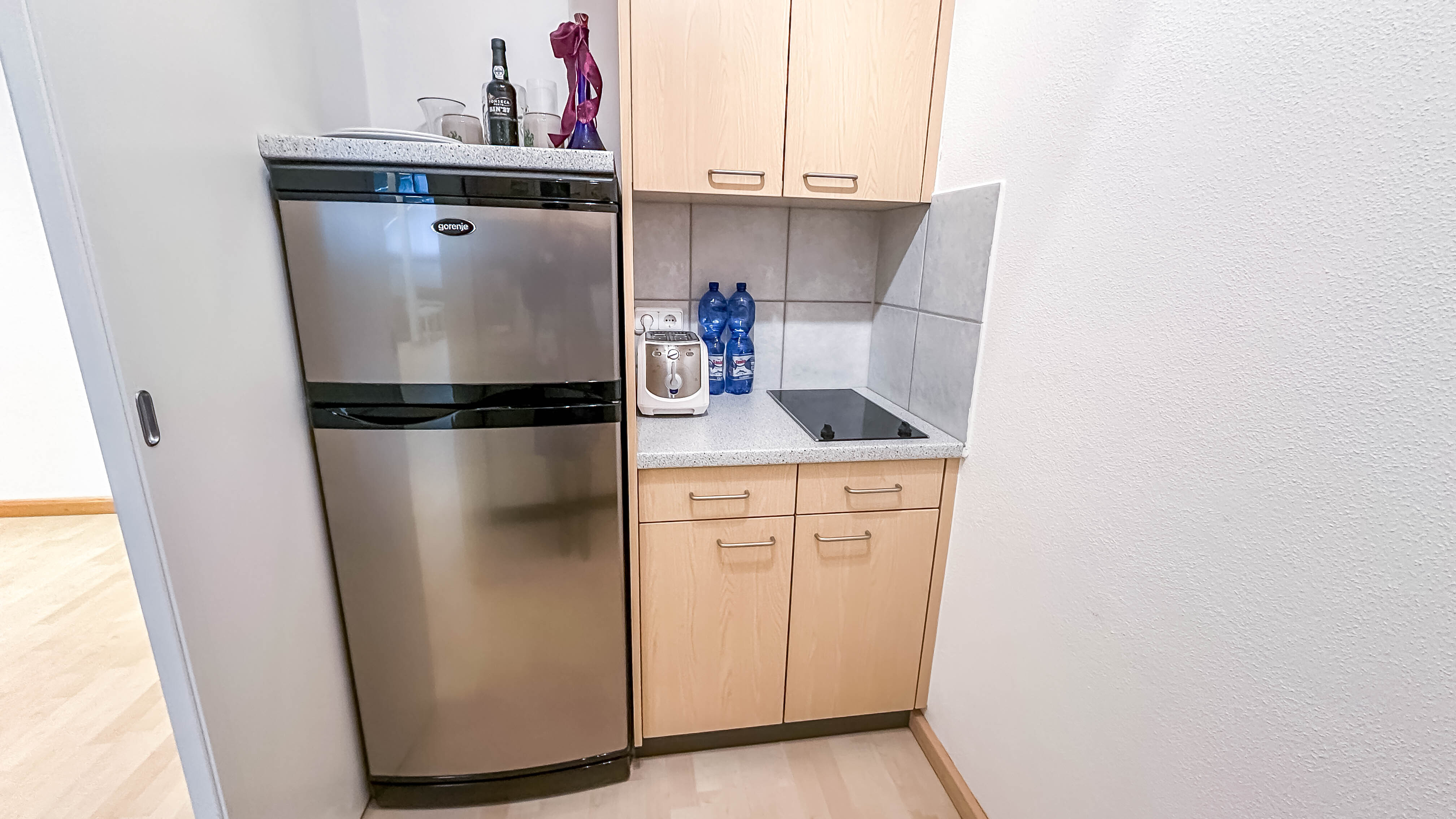 Für das kleine kalte oder warme Essen zwischendurch steht eine geeignet ausgestattete kleine Einbauküche, die mit einer Schiebetür vom Hauptraum abgetrennt ist, zur Verfügung: einen zwei-Plattenherd, Spüle, Kühl-/Gefrierkombination sowie Unter- und Oberschränke übergibt der aktuelle Mieter ohne Ablöse zu verlangen.
