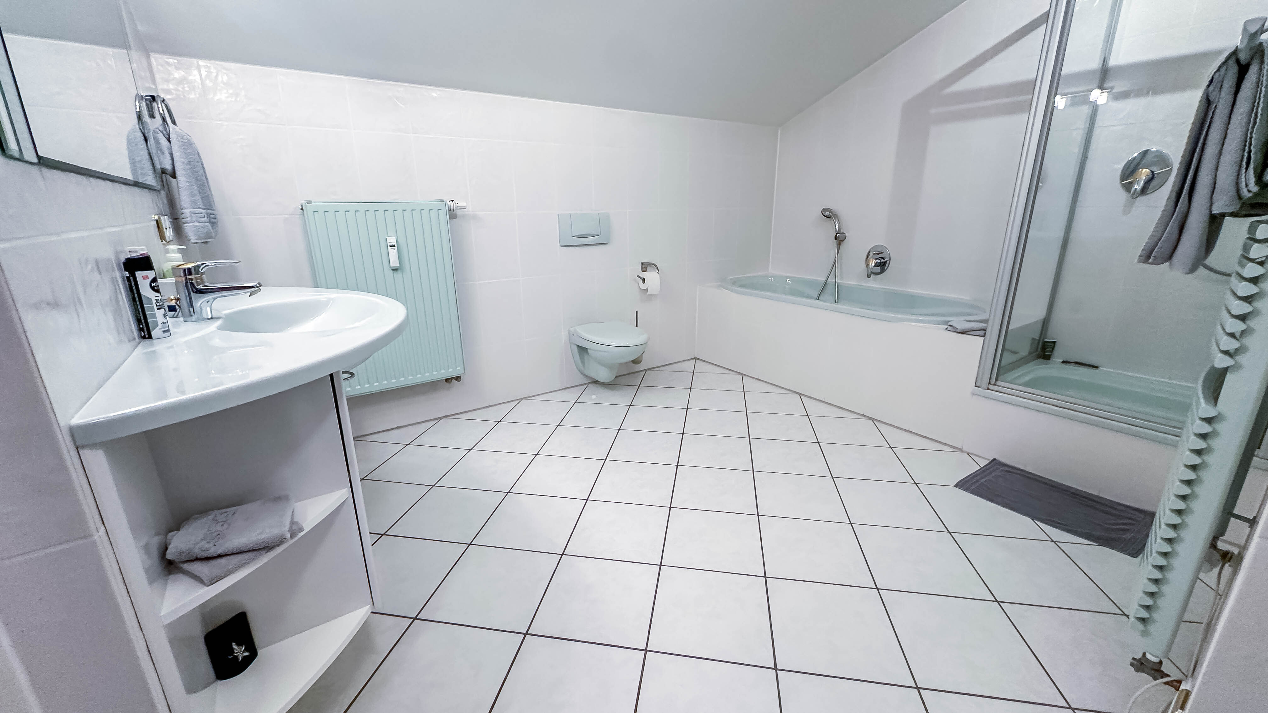 Ein modernes Badezimmer mit Badewanne und Dusche ergänzt das Raumangebot und sorgt für zusätzlichen Komfort.