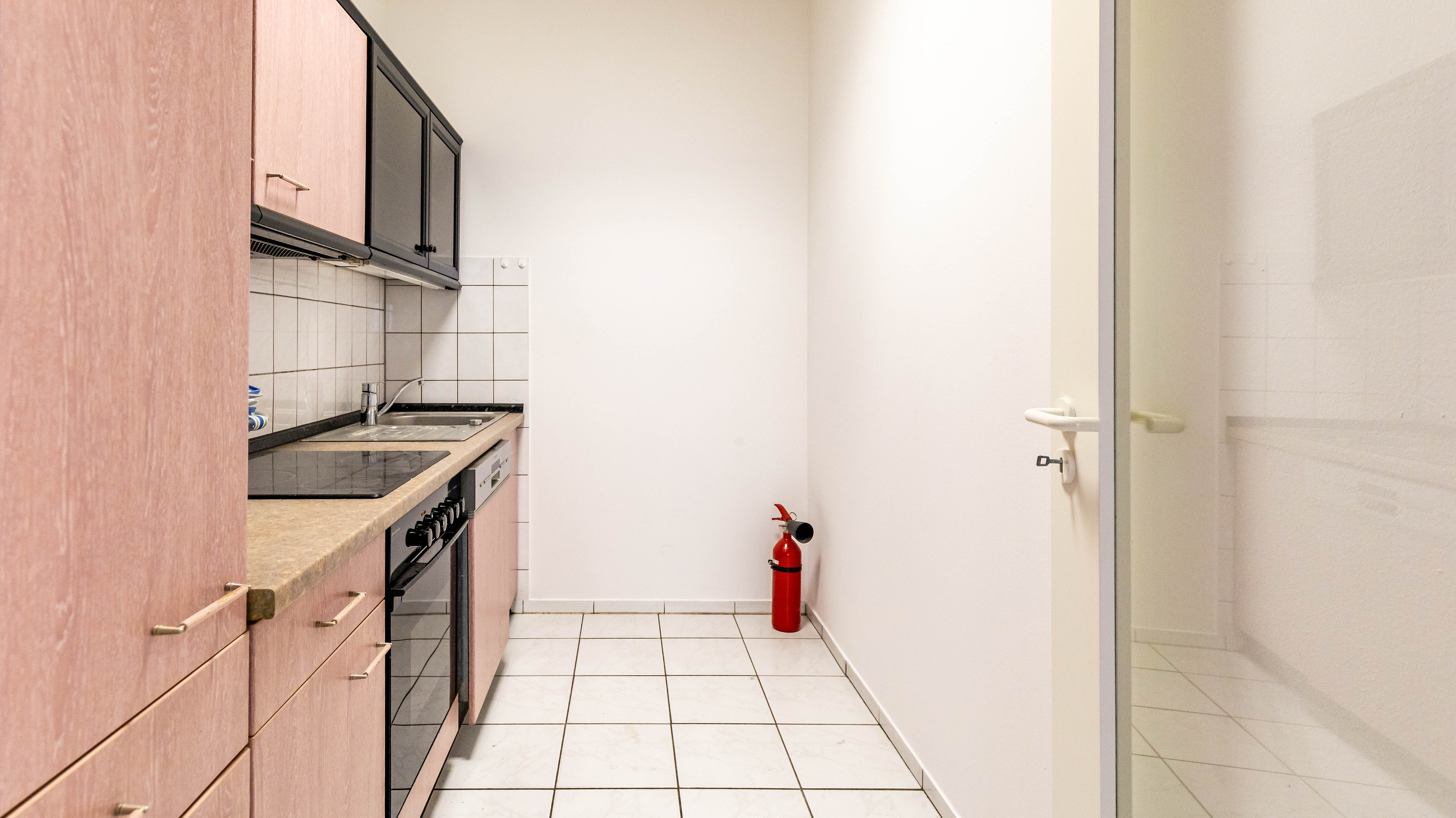 In den Bädern sowie in der Teeküche sind pflegeleichte weiße Fliesen verlegt, die eine helle und funktionale Atmosphäre schaffen. Die Teeküche wird vom Vermieter gestellt und bietet eine ideale Grundausstattung für Pausen und die Verpflegung im Arbeitsalltag.